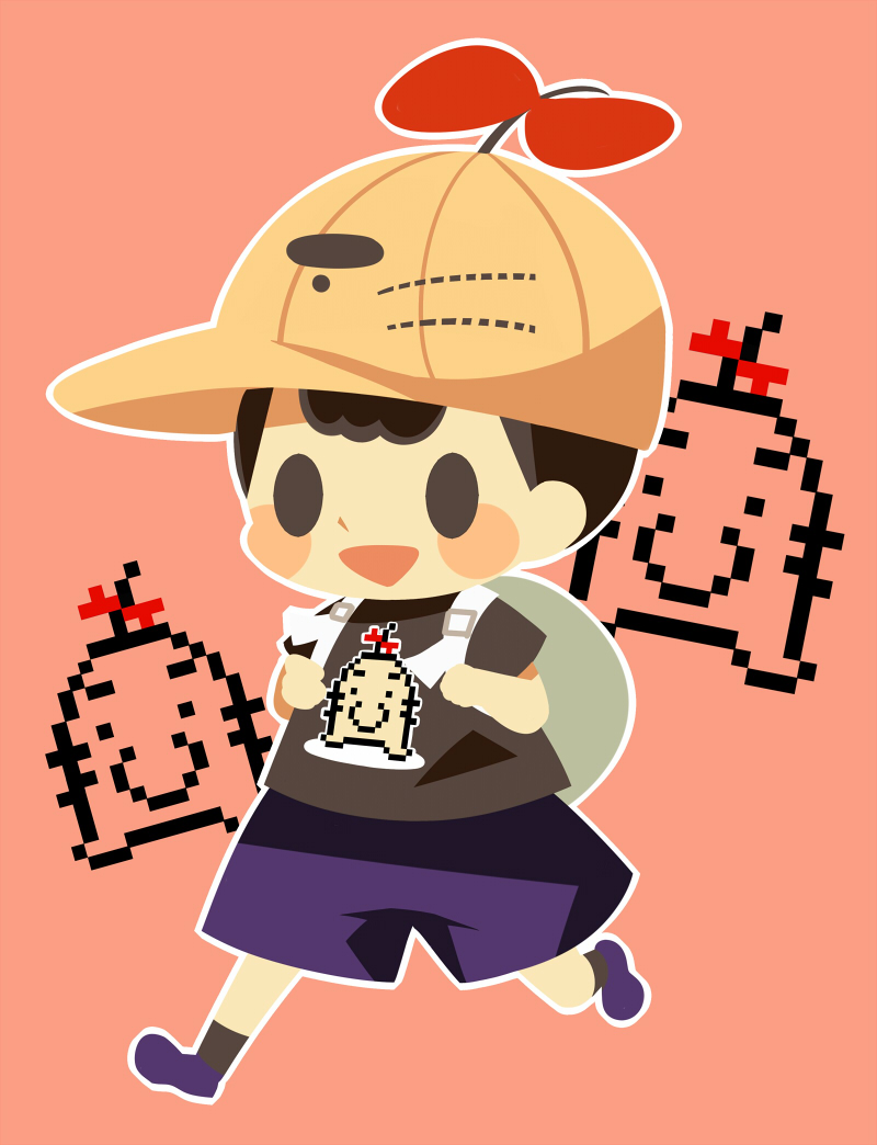 1boy black_hair black_shirt black_socks blush_stickers bow character_hat full_body grey_background hitofutarai male_focus mother_(series) mother_2 ness_(mother_2) nintendo open_mouth outline pink_background pixels purple_footwear purple_shorts red_bow running shirt short_hair shorts socks solid_oval_eyes solo super_smash_bros. white_outline