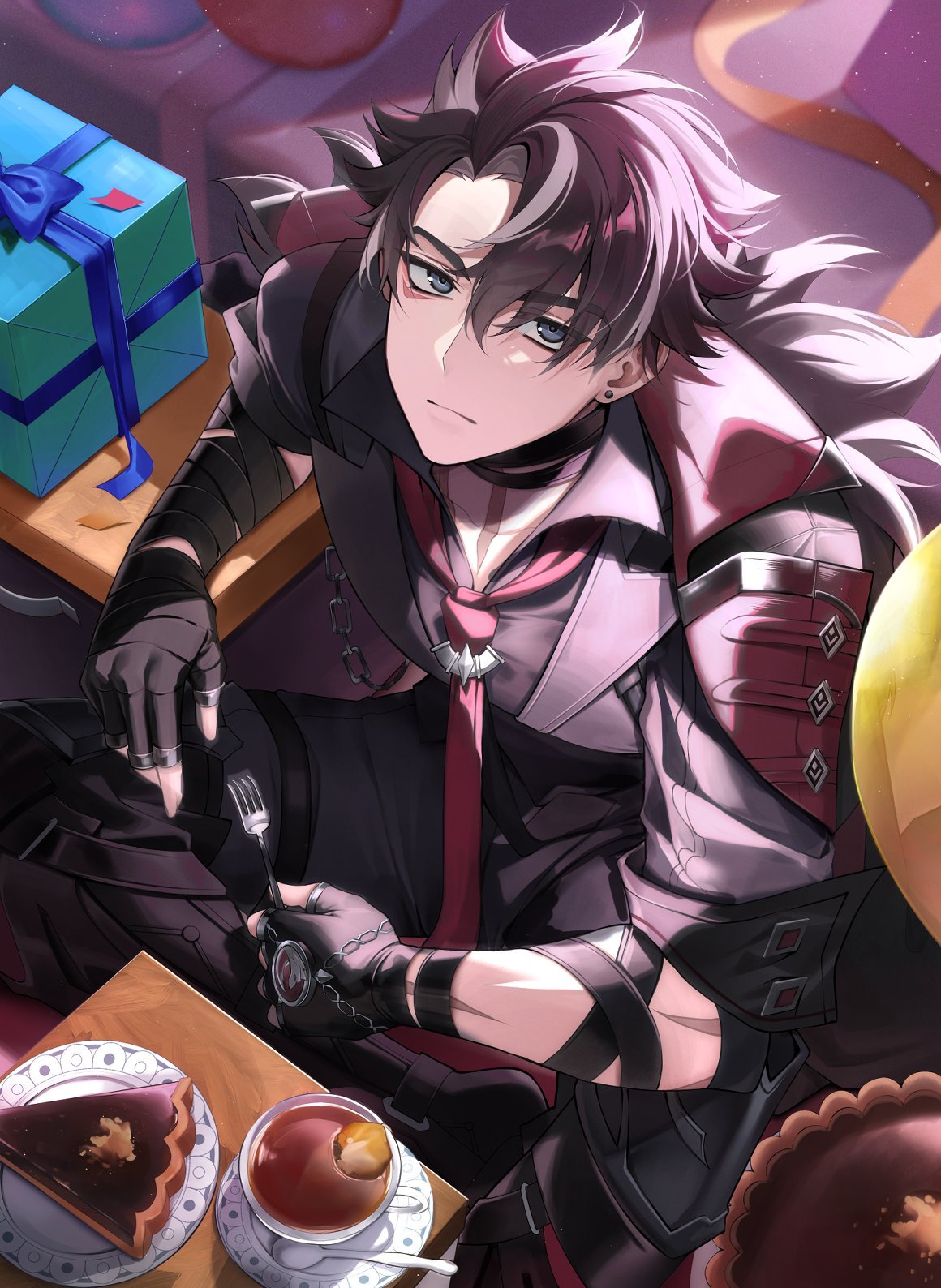 1boy balloon bandaged_arm bandaged_neck bandages black_boots black_gloves black_hair black_pants black_shirt boots box chain closed_mouth coat coat_on_shoulders collared_shirt commentary commentary_request confetti cup earrings english_commentary facial_scar fingerless_gloves food fork from_above frown fur-trimmed_coat fur_trim genshin_impact gift gift_box gloves grey_eyes grey_hair hair_between_eyes highres holding holding_fork jewelry lapels light_particles looking_at_viewer looking_up male_focus mixed-language_commentary multicolored_hair necktie pants parted_bangs pie pie_slice plate red_necktie saucer scar scar_on_arm scar_on_cheek scar_on_face scar_on_neck shirt short_hair short_sleeves sitting solcha solo spoon streaked_hair stud_earrings table tea teacup thigh_boots two-sided_coat two-sided_fabric wriothesley_(genshin_impact)