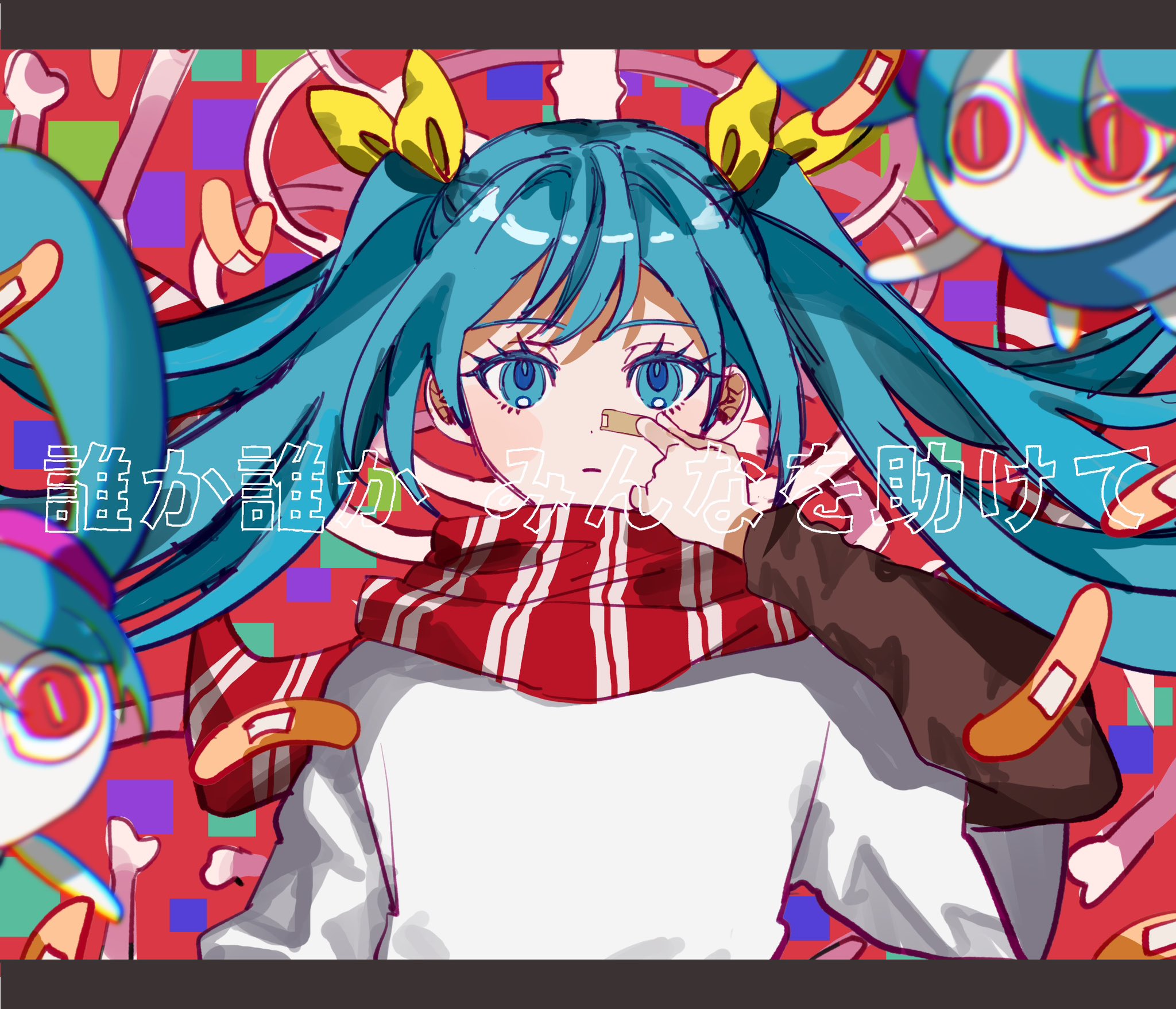 1girl :| aimaina arifureta_sekai_seifuku_(vocaloid) bandaid bandaid_on_face bandaid_on_nose black_shirt blue_eyes blue_hair blush bow closed_mouth dot_nose expressionless floating_hair hair_bow hatsune_miku highres letterboxed long_hair long_sleeves looking_at_viewer red_scarf removing_bandaid scarf shirt shirt_under_shirt short_sleeves sidelocks solo straight-on striped_clothes striped_scarf twintails upper_body vocaloid white_shirt xiexie_inu yellow_bow