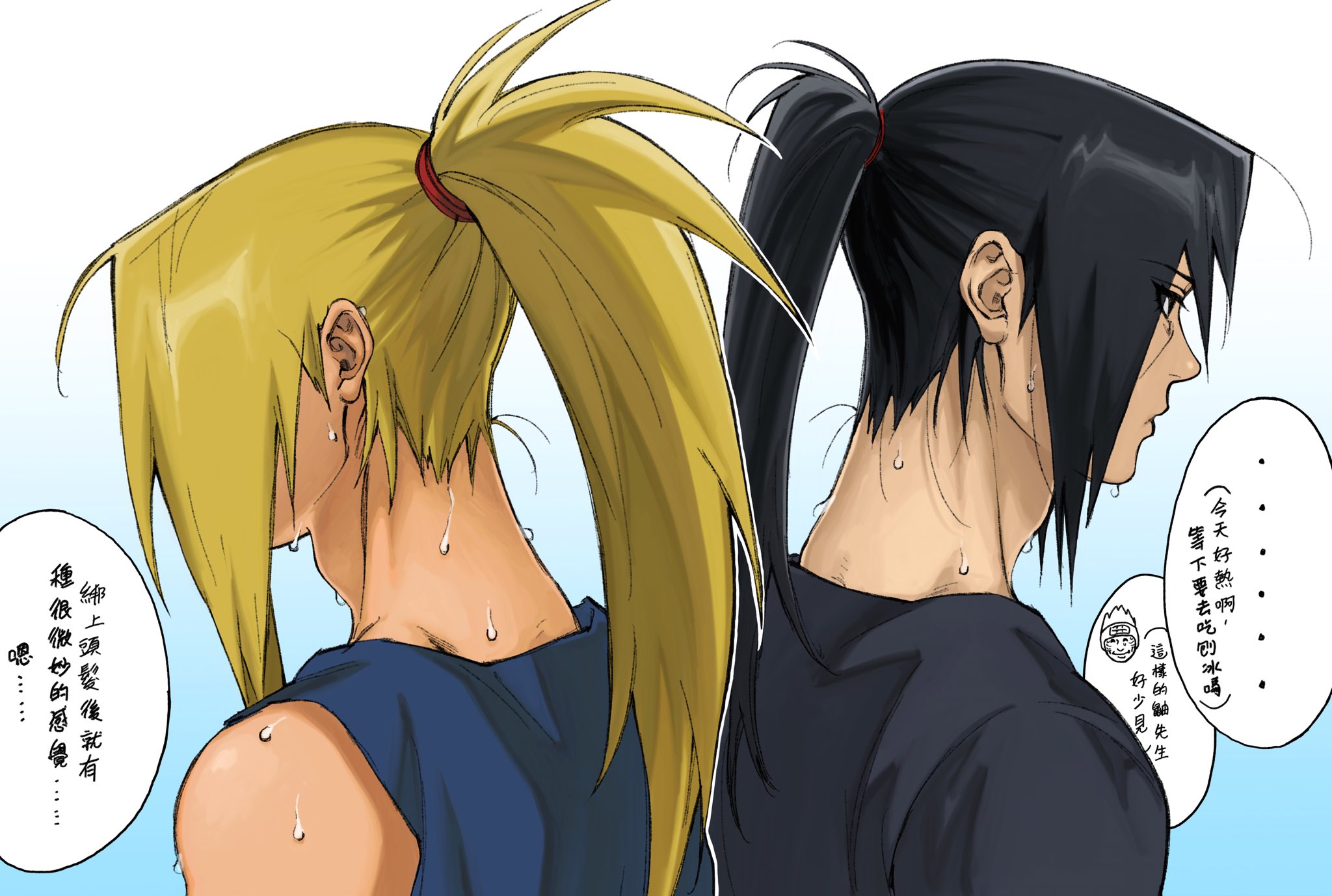 2boys adam's_apple alternate_costume alternate_hairstyle back-to-back black_hair black_shirt blonde_hair blue_shirt chibi chibi_inset commentary covered_face deidara_(naruto) from_side gradient_background high_ponytail highres long_hair looking_ahead male_focus matching_hairstyle multiple_boys naruto_(series) naruto_shippuuden ponytail portrait profile shirt sleeveless speech_bubble sweat untranslatable_commentary translation_request uchiha_itachi umkaqryi