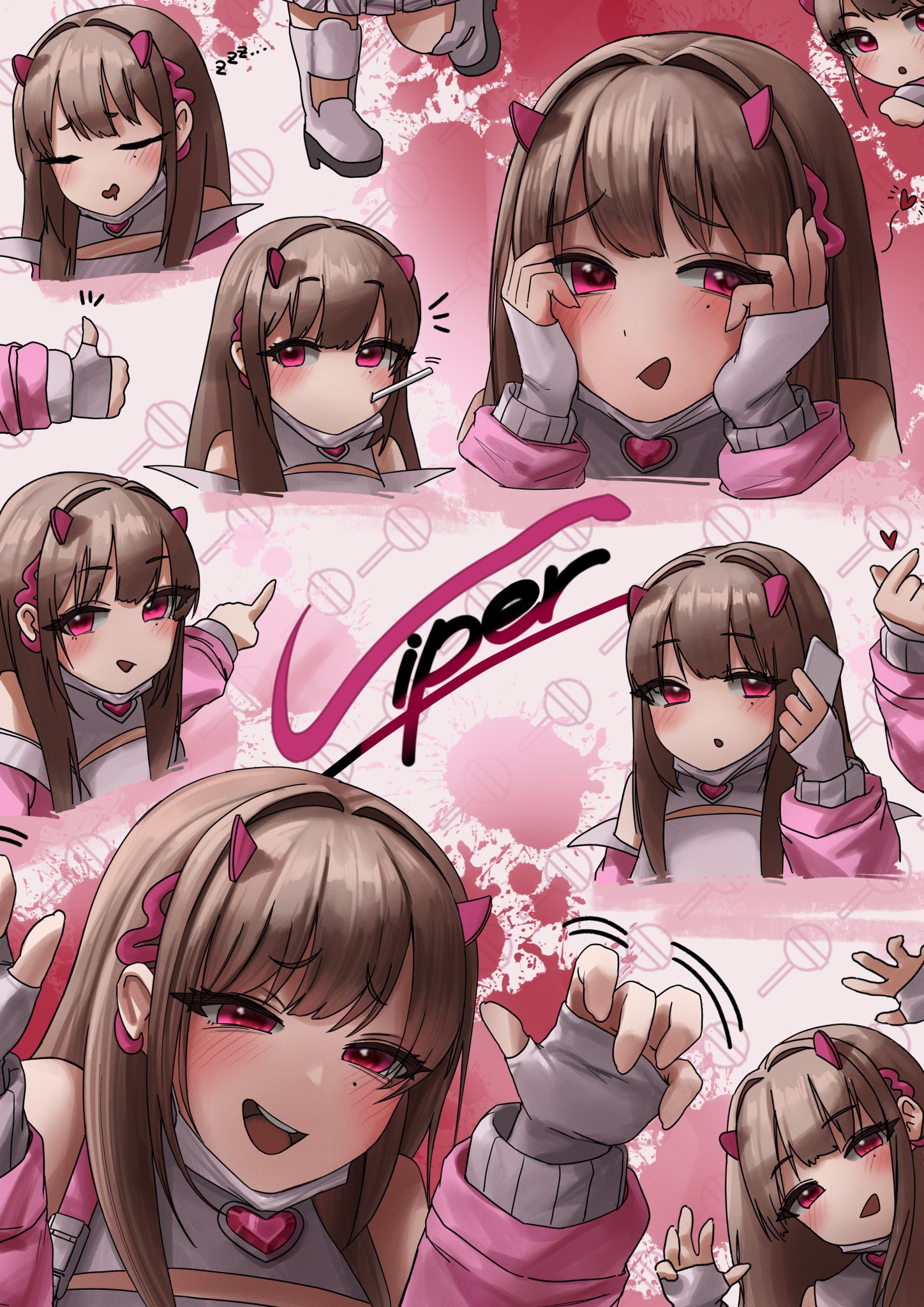 1girl :d bare_shoulders black_collar blush cellphone chain choker clothes_writing collar crop_top elbow_gloves fingerless_gloves fishnet_pantyhose fishnets gloves goddess_of_victory:_nikke hair_intakes heart_collar highres holding holding_phone iridescent_clothes horns jacket light_brown_hair long_hair mole mole_under_eye mouth_hold multiple_views o_o_k_i_n_a off-shoulder_jacket off_shoulder open_mouth pantyhose phone pink_horns pink_jacket pleated_skirt pointing red_eyes skirt smartphone smile thumbs_up viper_(nikke) white_skirt zipper zipper_pull_tab