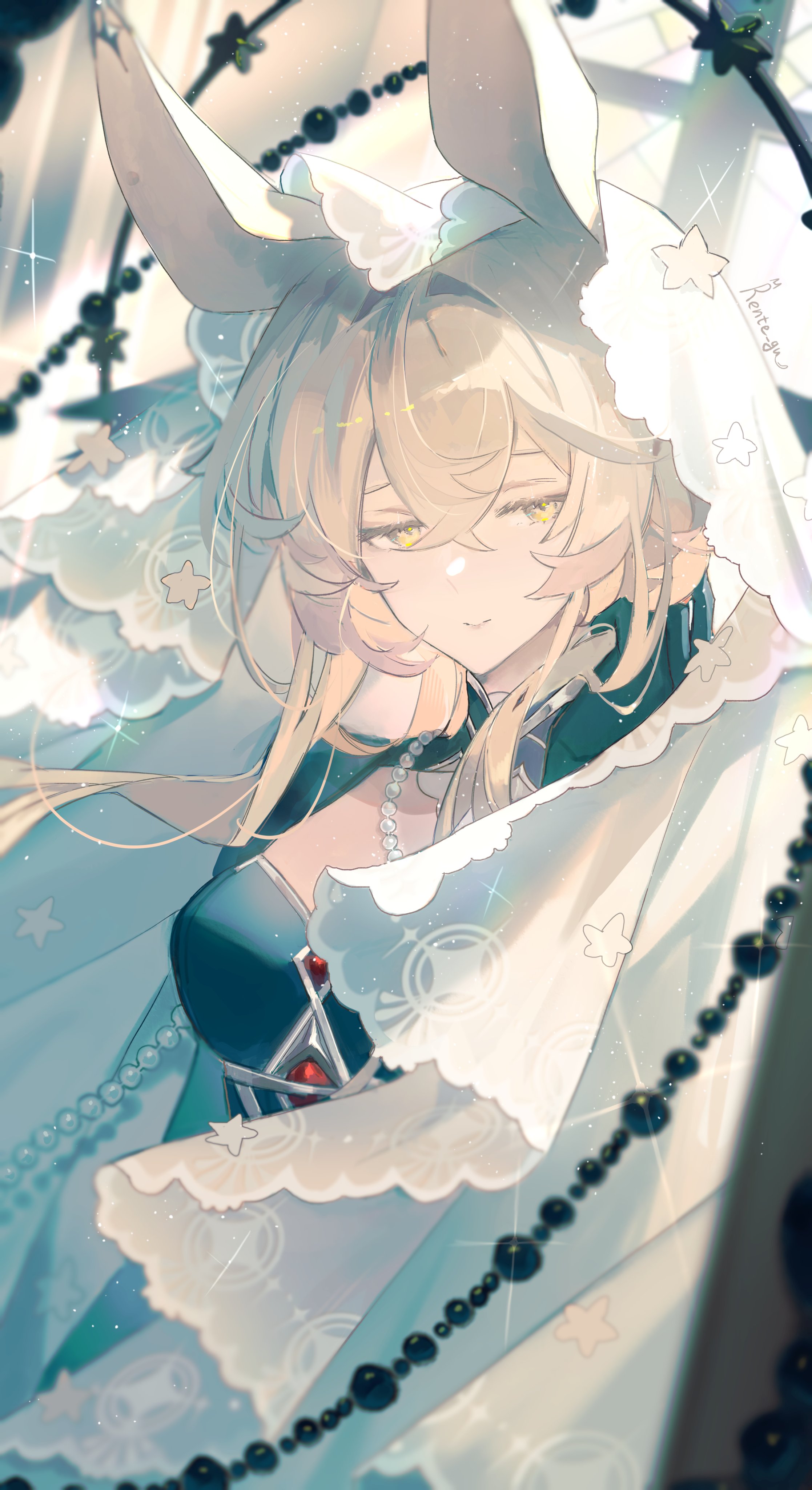 1girl absurdres animal_ears arknights blonde_hair highres jewelry necklace pearl_necklace rabbit_ears rabbit_girl rente_gu smile solo upper_body veil yellow_eyes
