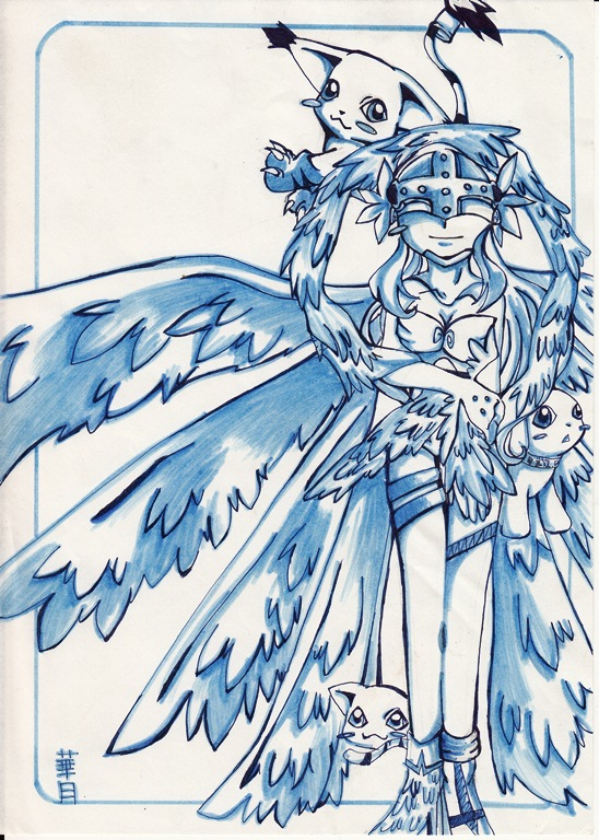 angel angel_girl angewomon animal_ears cat cat_ears digimon digimon_(creature) gloves head_wings holy_ring long_hair mask nyaromon plotmon tail tailmon wings