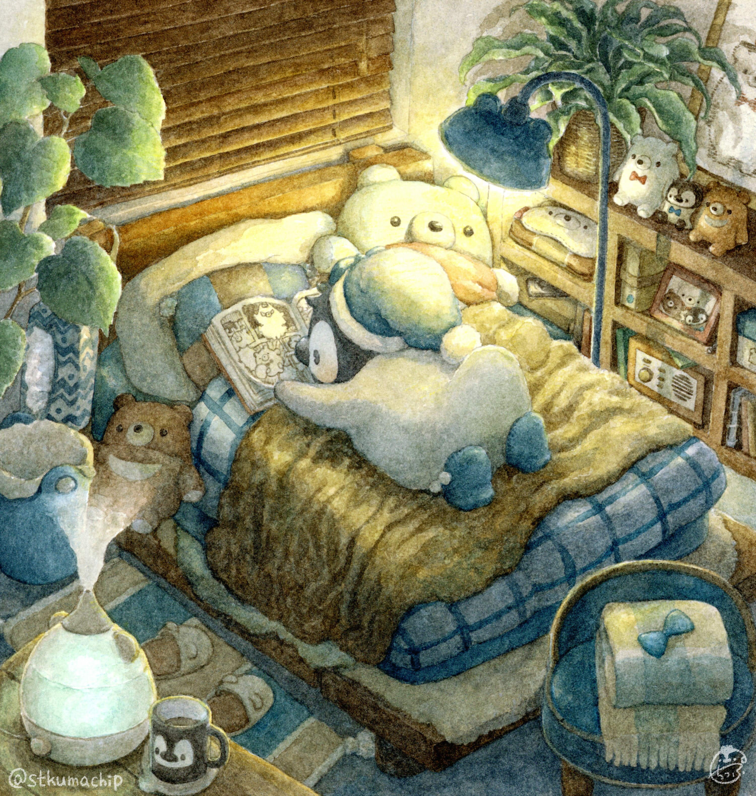 bed bird blue_headwear chair cup highres indoors lying mug no_humans on_stomach original penguin pillow plaid_clothes plaid_scarf scarf st.kuma stuffed_animal stuffed_penguin stuffed_toy teddy_bear window_blinds