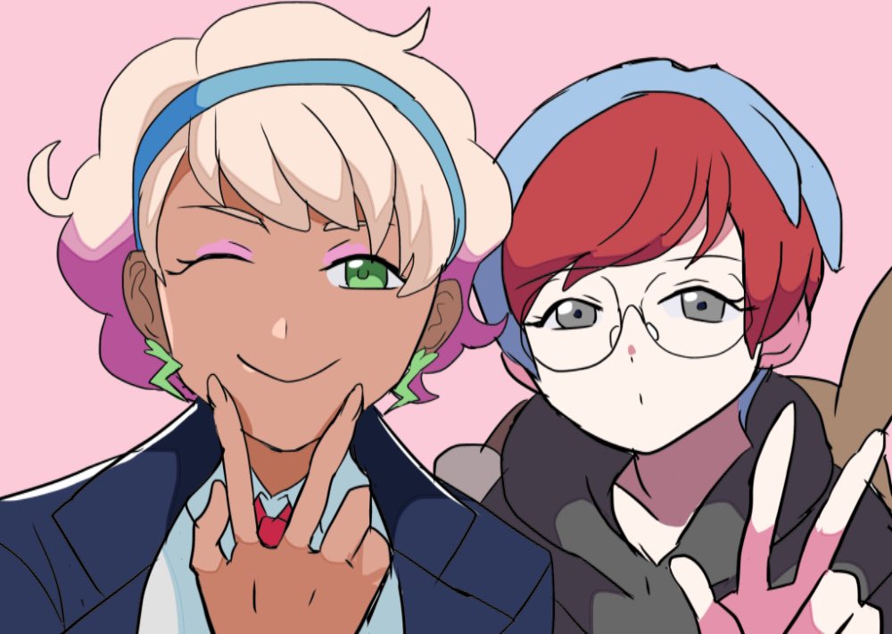 2girls aqua_eyes bag black_hoodie blue_hair blue_hairband brown_bag dark-skinned_female dark_skin earrings eyeshadow glasses gradient_hair grey_eyes grey_hair hairband hood hoodie jewelry long_sleeves makeup multicolored_hair multiple_girls necktie nintendo one_eye_closed penny_(pokemon) peonia_(pokemon) pink_eyeshadow pink_hair pokemon pokemon_scarlet_and_violet pokemon_sword_and_shield red_hair red_necktie rem_(eyes_410) round_eyewear school_uniform short_hair siblings sisters swept_bangs two-tone_hair v very_short_hair