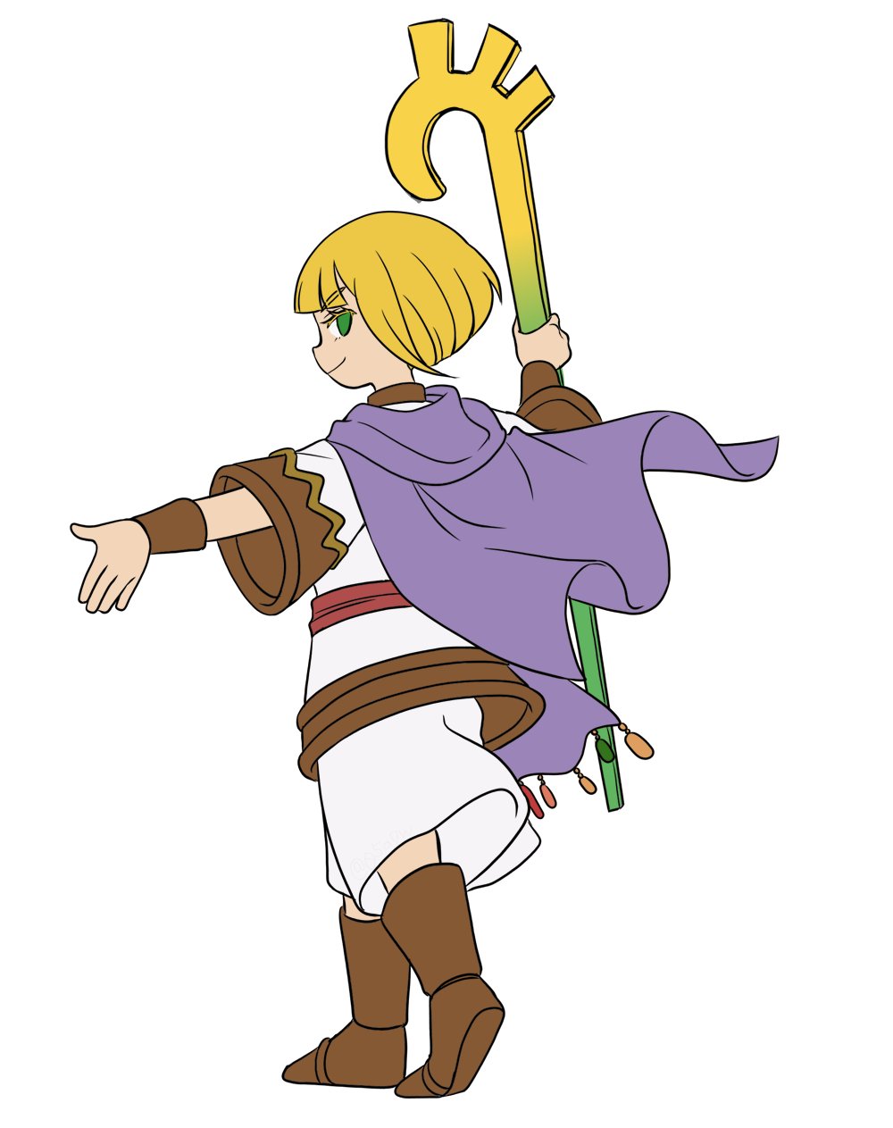 05a7w 1girl blonde_hair boots cape closed_mouth full_body golden_sun green_eyes highres holding holding_staff looking_at_viewer sheba_(golden_sun) short_hair simple_background smile solo staff white_background