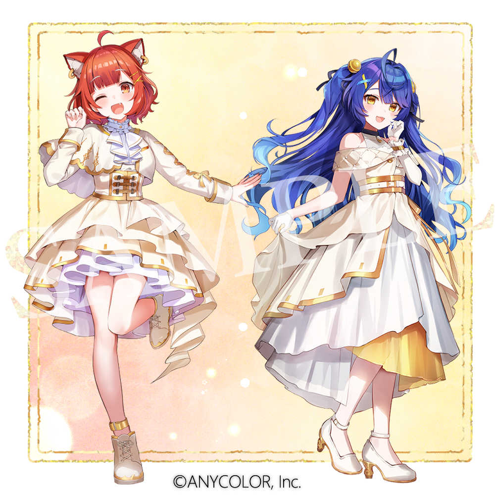 2girls ahoge amamiya_kokoro ascot bell blue_hair boots cropped_jacket dress gloves gold_trim hair_bell hair_ornament head_tilt holding_own_dress jacket lace-up_boots layered_dress long_sleeves multiple_girls nijisanji off_shoulder official_art outside_border ratna_petit red_panda_ears red_panda_girl sample_watermark standing standing_on_one_leg two_side_up virtual_youtuber watermark white_ascot white_footwear white_gloves x_hair_ornament yellow_dress yellow_eyes yellow_jacket yumesaki_nana