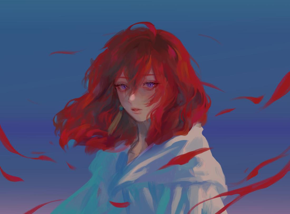 1girl akatsuki_no_yona bad_id bad_twitter_id blue_background coat commentary_request earrings hair_between_eyes jewelry korean_commentary looking_at_viewer medium_hair purple_eyes red_hair solo upper_body white_coat yona_(akatsuki_no_yona) yona_hyeon