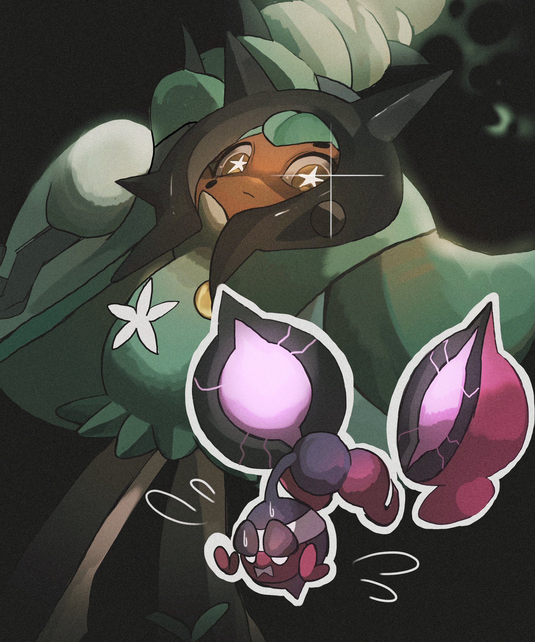 2others club club_(weapon) fangs highres holding holding_weapon impending_doom multiple_others nintendo no_humans ogerpon oni open_mouth pecharunt pokemon pokemon_(creature) reo_(mmocc123) simple_background spiked_club star-shaped_pupils star_(symbol) sweat symbol-shaped_pupils weapon yellow_eyes