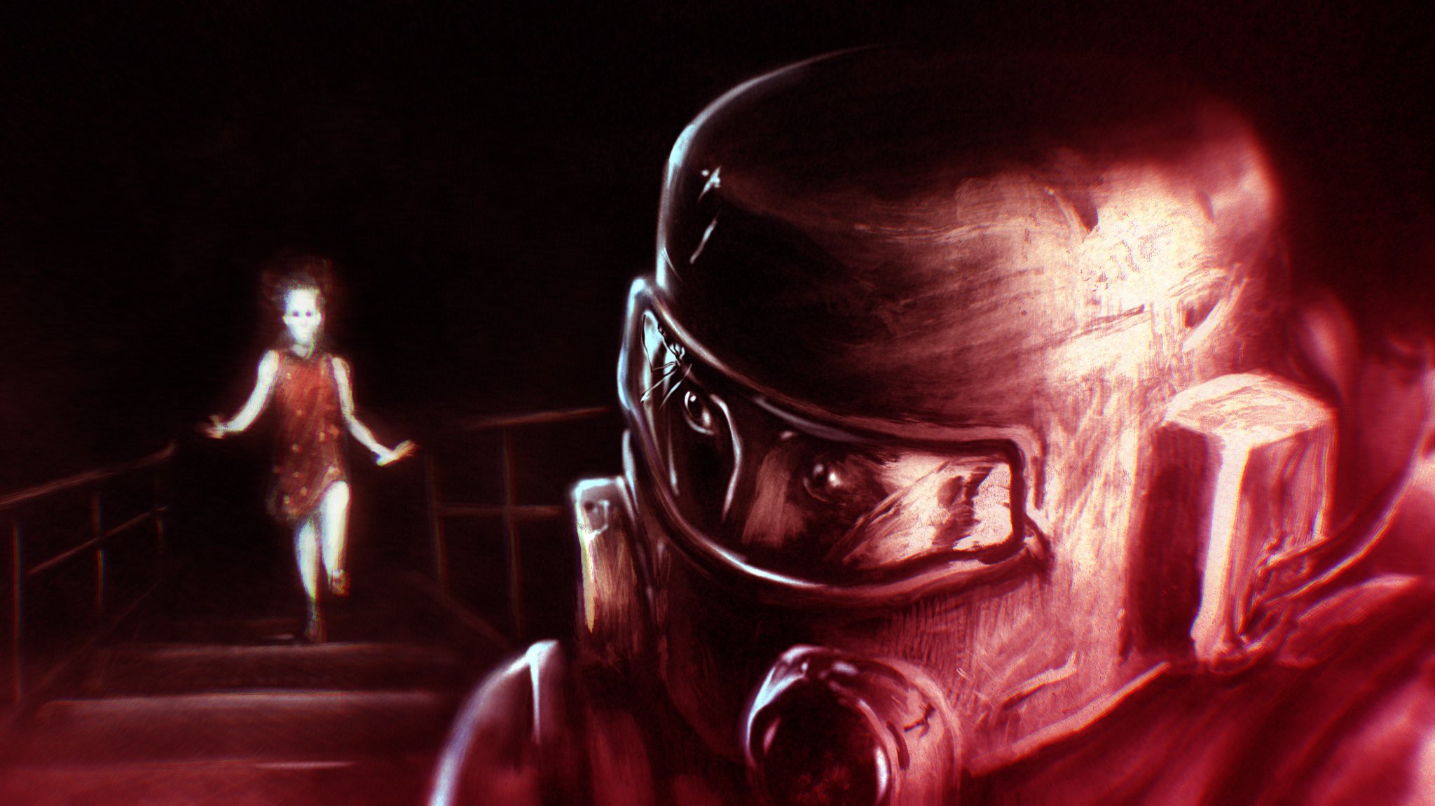 1boy 1girl 1other d_d_take dress ghost_girl_(lethal_company) hazmat_suit helmet highres impending_doom indoors lethal_company monster oxygen_mask red_dress tube worker_(lethal_company)