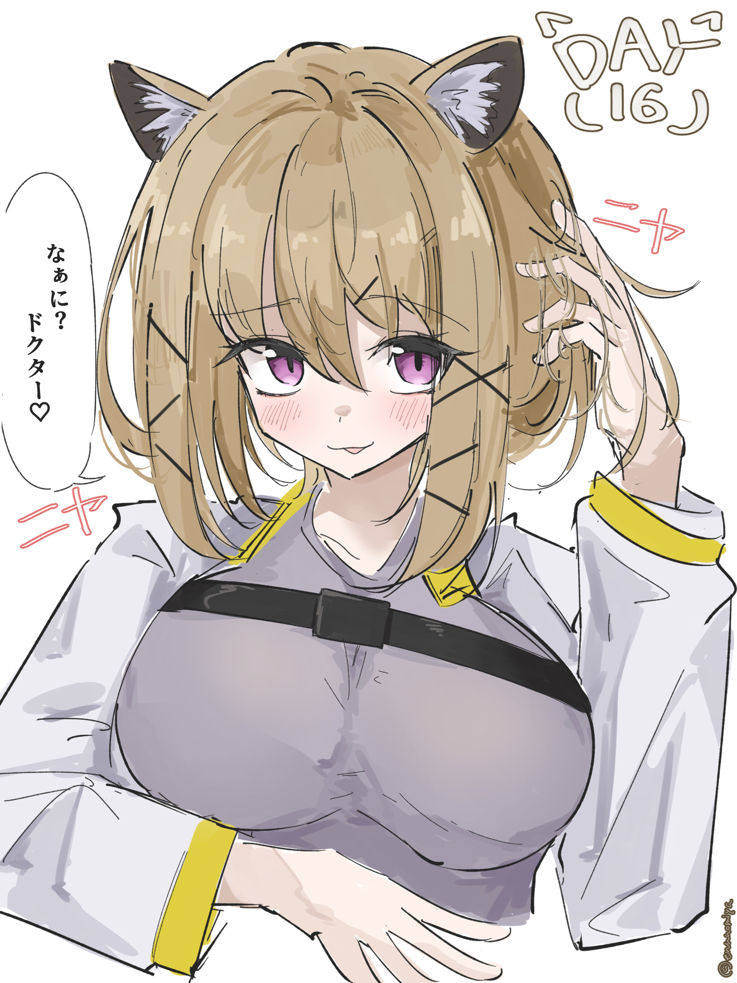 1girl animal_ear_fluff arknights blush breasts brown_hair enunomiya hand_in_own_hair highres large_breasts long_sleeves purple_eyes short_hair simple_background smile solo speech_bubble upper_body utage_(arknights) white_background