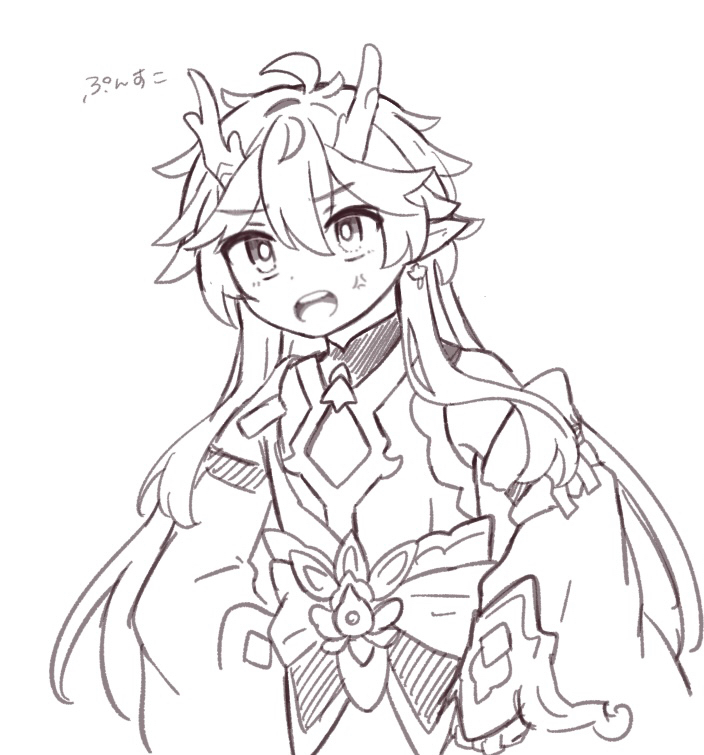 1boy ahoge anger_vein brooch cleavage_cutout clothing_cutout collared_shirt commentary_request dan_heng_(honkai:_star_rail) dan_heng_(imbibitor_lunae)_(honkai:_star_rail) dot_nose dragon_horns earrings eastern_dragon_horns hair_between_eyes hands_on_own_hips hara_(nanohara) honkai:_star_rail honkai_(series) horns jewelry long_hair long_sleeves male_focus monochrome pointy_ears sash shirt simple_background single_bare_shoulder sketch solo teeth translation_request upper_body upper_teeth_only very_long_hair waist_sash white_background wide_sleeves