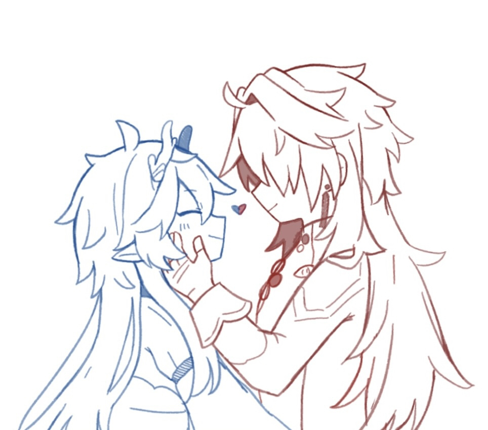 2boys ahoge blade_(honkai:_star_rail) blush closed_eyes collared_coat color-coded colored_lineart commentary_request covered_eyes dan_heng_(honkai:_star_rail) dan_heng_(imbibitor_lunae)_(honkai:_star_rail) duo_chromatic earrings facing_another from_side hair_intakes hand_on_another's_cheek hand_on_another's_face hara_(nanohara) heart honkai:_star_rail honkai_(series) horns jewelry long_hair long_sleeves male_focus multiple_boys pointy_ears profile shirt simple_background sleeve_cuffs smile upper_body very_long_hair white_background yaoi