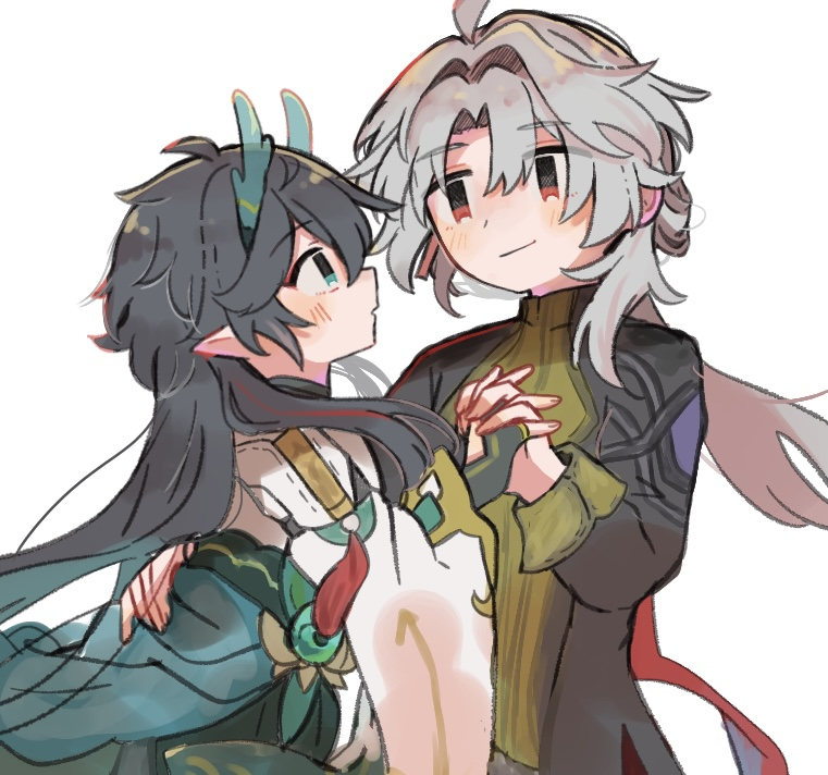 2boys ahoge alternate_hair_color black_hair black_sleeves blade_(honkai:_star_rail) blush chinese_clothes closed_mouth commentary_request couch dan_heng_(honkai:_star_rail) dan_heng_(imbibitor_lunae)_(honkai:_star_rail) dragon_boy dragon_horns earrings eastern_dragon_horns eyeliner fingerless_gloves gloves green_eyes green_hood hand_on_another's_back hara_(nanohara) height_chart honkai:_star_rail honkai_(series) horns interlocked_fingers jewelry long_hair looking_at_another makeup male_focus multiple_boys parted_bangs pointy_ears ponytail red_eyeliner simple_background smile upper_body white_background white_hair white_sleeves yaoi yingxing_(honkai:_star_rail)