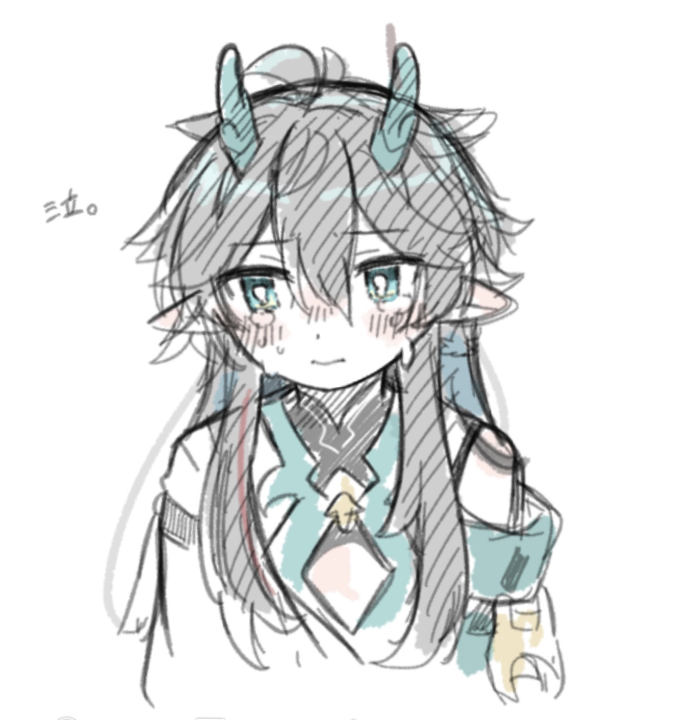 1boy aqua_eyes aqua_horns arms_at_sides black_hair blush cleavage_cutout closed_mouth clothing_cutout collared_shirt cropped_torso crying crying_with_eyes_open dan_heng_(honkai:_star_rail) dan_heng_(imbibitor_lunae)_(honkai:_star_rail) dot_nose hara_(nanohara) hatching_(texture) highres honkai:_star_rail honkai_(series) horns jacket linear_hatching male_focus pointy_ears shirt simple_background single_bare_shoulder sketch solo tears translation_request upper_body white_background