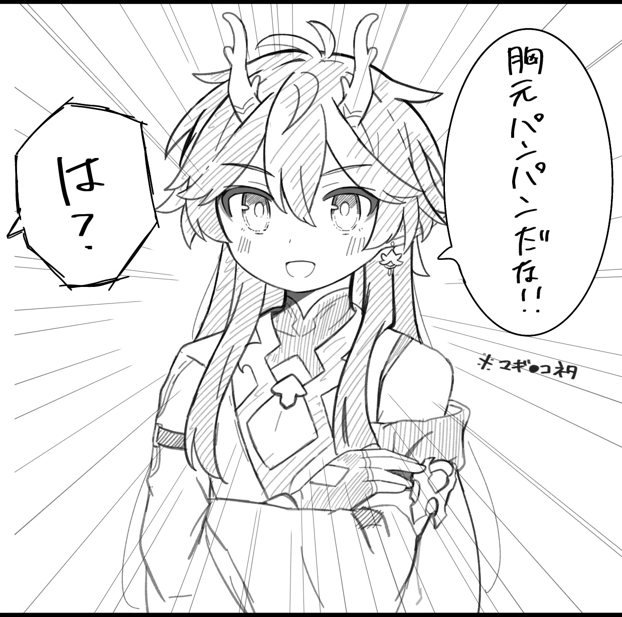1boy :d blush cleavage_cutout clothing_cutout collared_shirt commentary_request crossed_arms dan_heng_(honkai:_star_rail) dan_heng_(imbibitor_lunae)_(honkai:_star_rail) dot_nose dragon_horns earrings eastern_dragon_horns emphasis_lines greyscale hair_between_eyes hara_(nanohara) hatching_(texture) highres honkai:_star_rail honkai_(series) horns jacket jewelry long_hair long_sleeves male_focus monochrome open_mouth pectoral_cleavage pectorals pointy_ears shirt single_bare_shoulder sketch smile solo speech_bubble translation_request upper_body very_long_hair