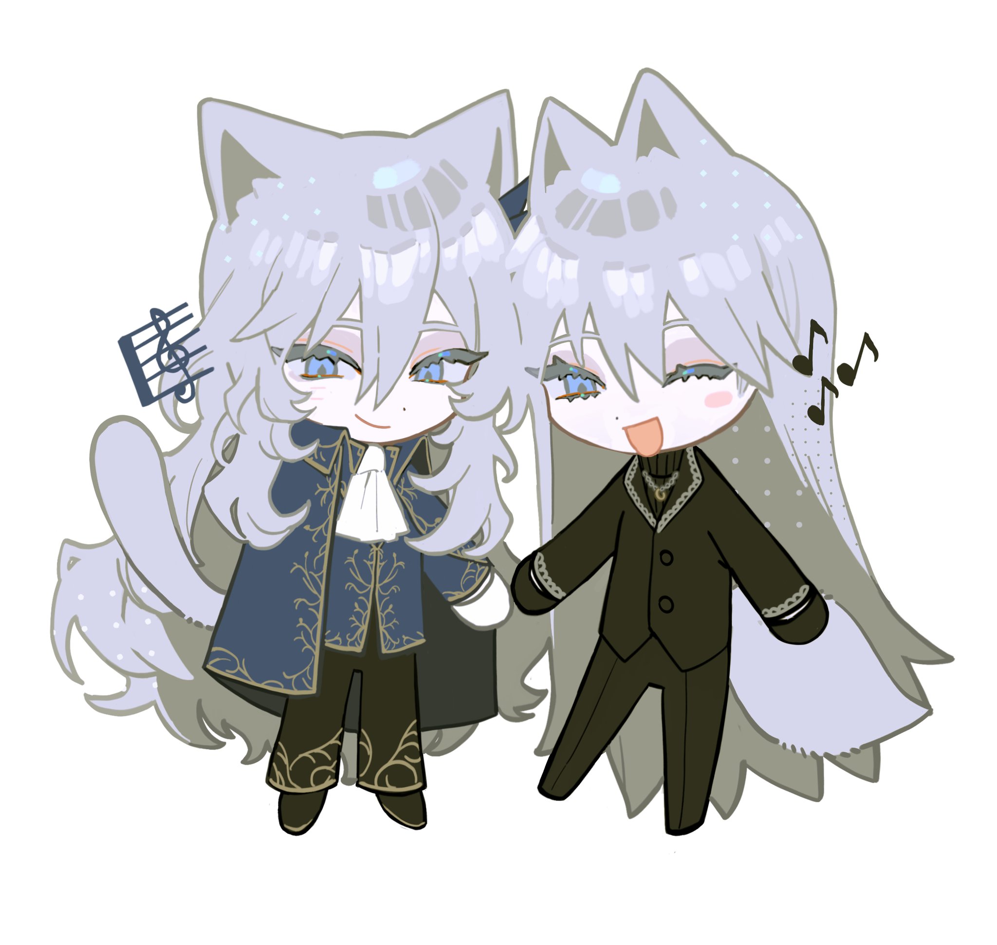 1boy 1girl angelica_(project_moon) animal_ears argalia_(project_moon) ascot black_gloves black_jacket black_pants blue_cape blue_jacket blush brother_and_sister cape cat_ears cat_tail chibi fox_ears fox_tail full_body gloves gold_trim haloyxxxxxxx highres jacket library_of_ruina long_hair long_sleeves music one_eye_closed open_mouth pants project_moon siblings smile tail very_long_hair white_ascot white_hair