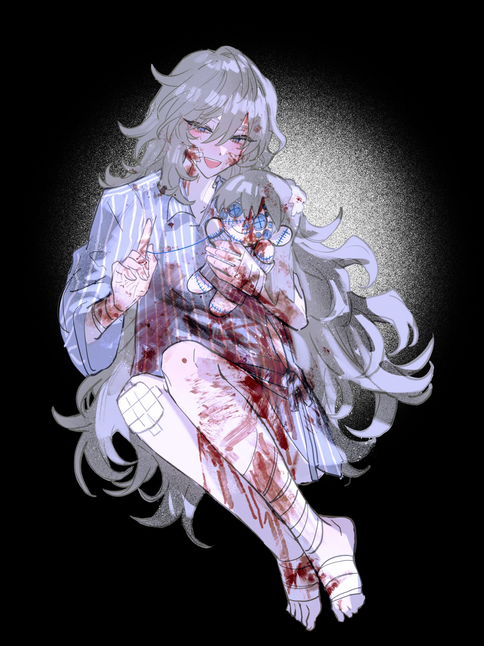 1boy angelica_(project_moon) argalia_(project_moon) bandaged_leg bandages blood blood_on_clothes blood_on_face blue_eyes character_doll doll gauze gauze_on_knee haloyxxxxxxx highres library_of_ruina long_hair looking_at_viewer male_focus open_mouth project_moon sitting smile solo very_long_hair white_hair