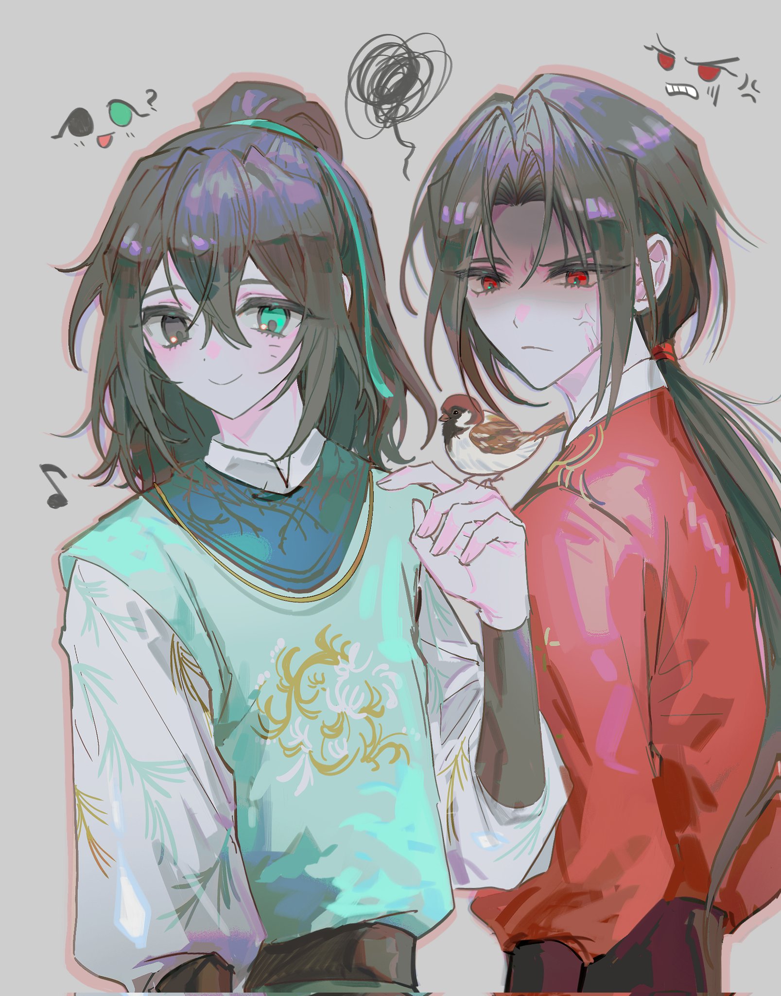 aged_down aqua_eyes black_eyes black_hair blue_vest haloyxxxxxxx heterochromia high_ponytail highres hong_lu_(project_moon) jia_huan_(project_moon) limbus_company long_sleeves low_ponytail parted_bangs ponytail project_moon puffy_long_sleeves puffy_sleeves red_eyes red_shirt shirt simple_background upper_body vest white_background white_shirt