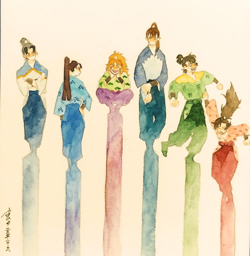 6+boys arm_guards arm_up ashio_1489 blending blue_pants boots brown_hair closed_eyes clothes_grab crossed_arms dated facial_scar facing_viewer floating_hair green_pants hakama hand_on_own_hip hands_on_own_cheeks hands_on_own_face japanese_clothes kema_tomesaburou kimono laughing long_hair long_sleeves looking_at_another looking_to_the_side male_focus multiple_boys nakazaike_chouji nanamatsu_koheita on_top_of_pole open_mouth painting_(medium) pants parted_bangs ponytail pulling purple_pants rakudai_ninja_rantarou red_pants scar scar_on_cheek scar_on_face shioe_monjirou sideways_glance signature simple_background smile squatting standing standing_on_one_leg tachibana_senzou traditional_media watercolor_(medium) zenpouji_isaku