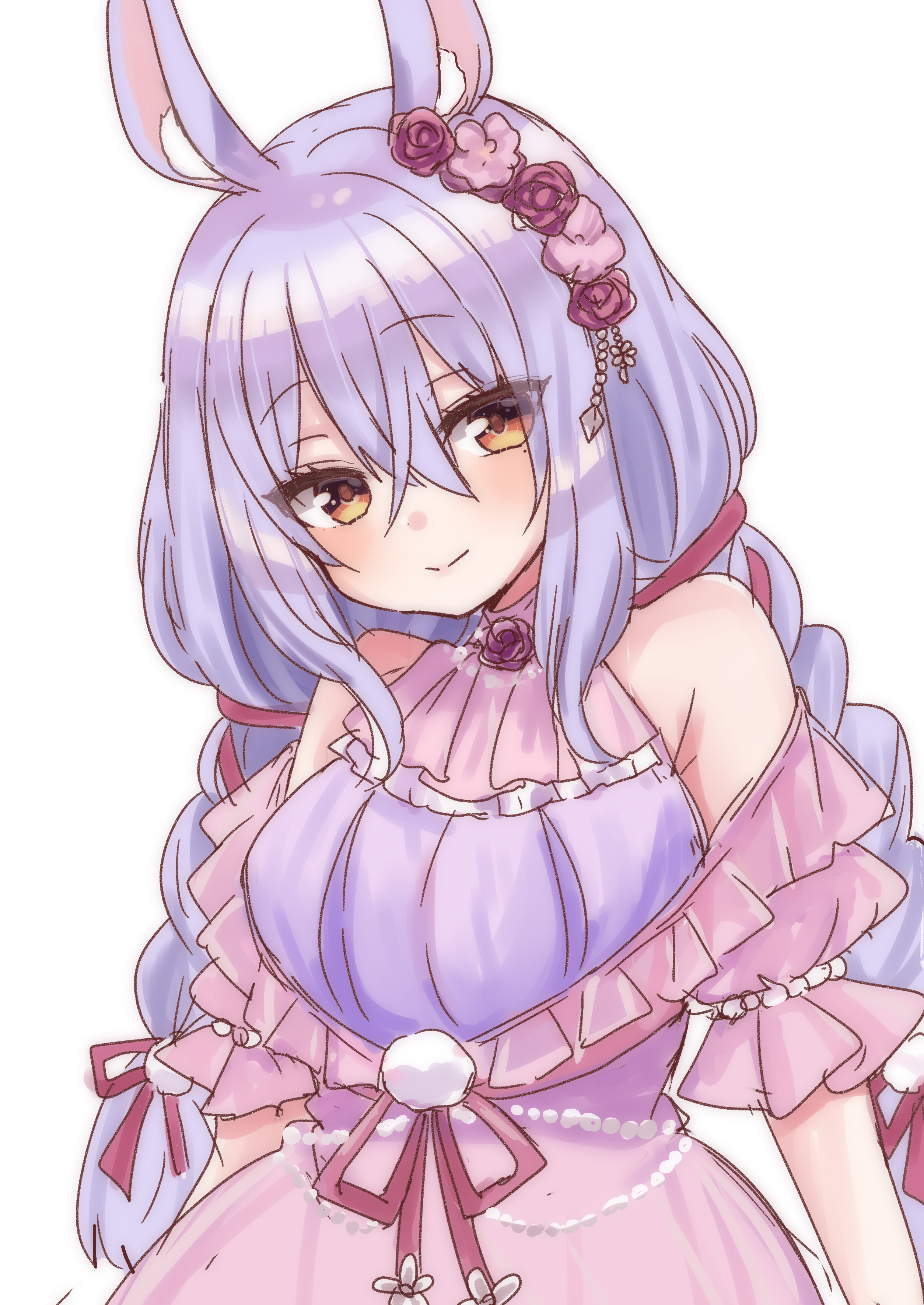 1girl absurdres animal_ear_fluff animal_ears ascot bare_shoulders braid closed_mouth commentary cowboy_shot dress flower hair_between_eyes hair_flower hair_ornament highres himesaki_yuzuru long_hair looking_at_viewer low_twintails noripro orange_eyes pink_ascot pink_dress purple_hair rabbit_ears roboro935672 simple_background smile solo standing twin_braids twintails very_long_hair virtual_youtuber white_background