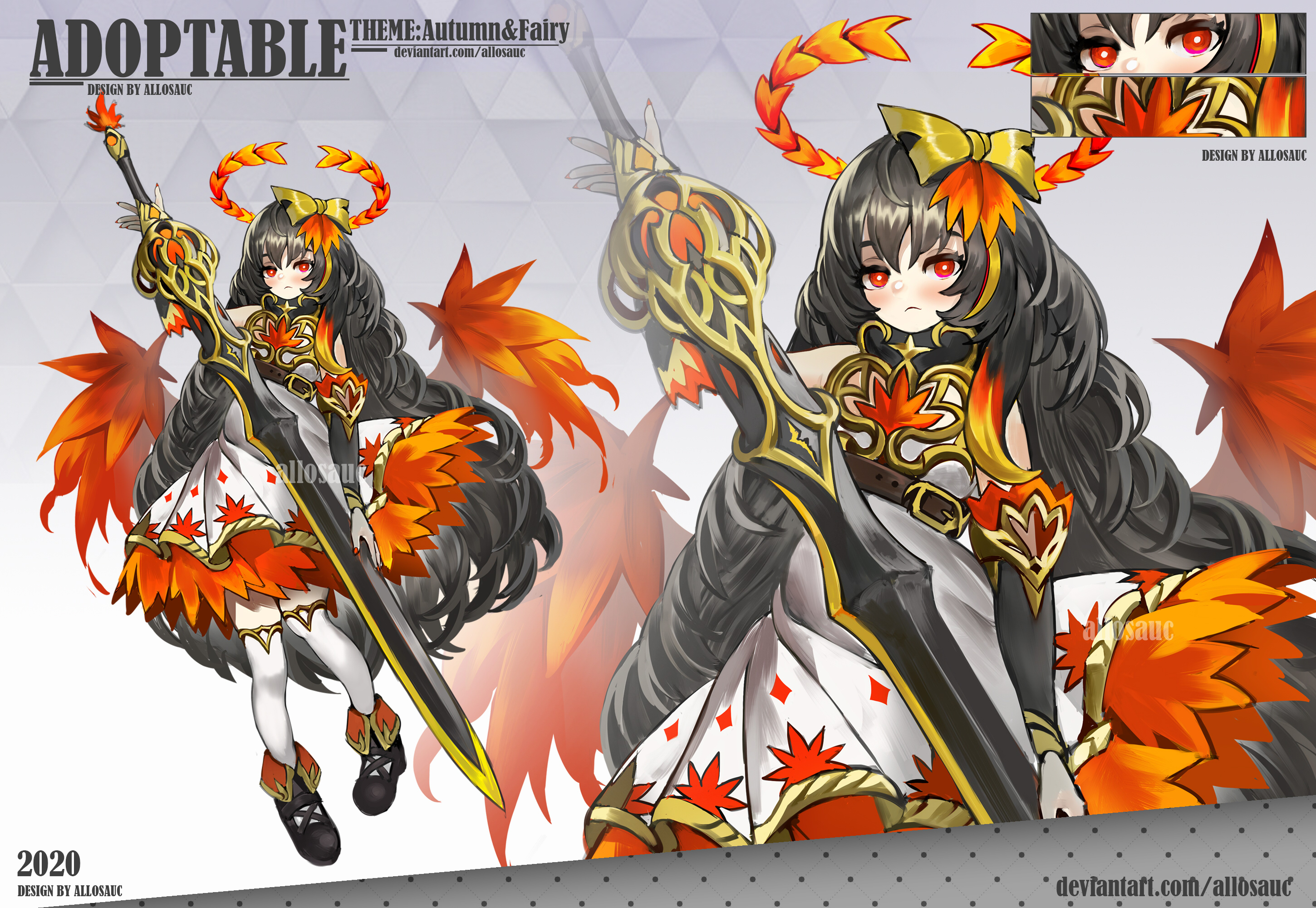 1girl 2020 adoptable allosauc artist_name autumn_leaves bare_shoulders belt belt_buckle black_footwear black_hair black_scarf black_sleeves blonde_hair boots bow brown_belt buckle reference_sheet close-up closed_mouth commentary cowboy_shot cross-laced_footwear detached_sleeves deviantart_username dress english_commentary english_text eyelashes fairy fairy_wings frown full_body gold_trim gradient_background grey_background hair_bow hair_ornament halo highres holding holding_sword holding_weapon huge_weapon leaf leaf_hair_ornament light_blush long_hair long_sleeves looking_at_viewer loose_hair_strand multicolored_hair multiple_views nail_polish orange_halo orange_nails orange_wings original red_eyes scarf simple_background single_sidelock sleeveless sleeveless_dress streaked_hair sword thighhighs triangle_background very_long_hair watermark weapon white_dress white_thighhighs wings yellow_bow