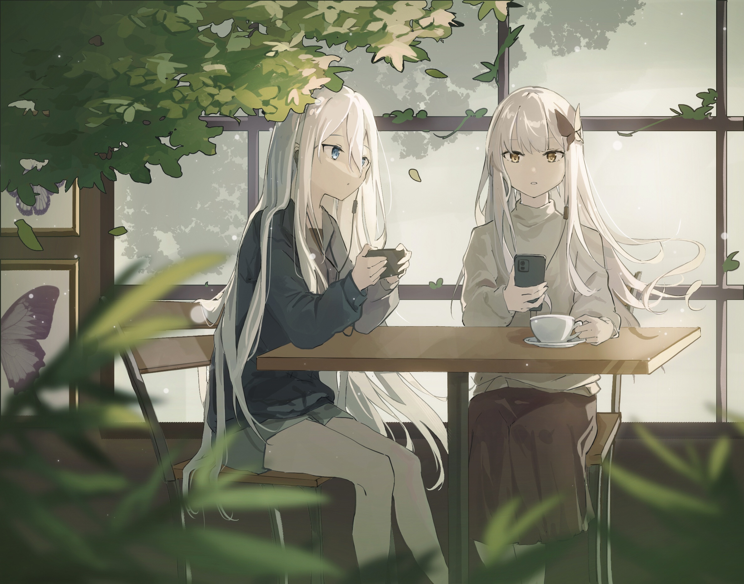 2girls animal_print bang_dream! bang_dream!_girls_band_party! blue_eyes blue_jacket brown_skirt butterfly_hair_ornament butterfly_print cellphone chair commission crossover cup earphones elbow_on_table falling_leaves grey_shorts grey_sweater hair_ornament hair_spread_out highres holding holding_phone jacket kafuuchino_(chouti) leaf long_hair long_skirt minato_yukina multiple_girls parted_lips phone picture_frame plant project_sekai saucer shorts sitting skirt smartphone sweater swept_bangs table teacup turtleneck turtleneck_sweater very_long_hair white_hair window yellow_eyes yoisaki_kanade