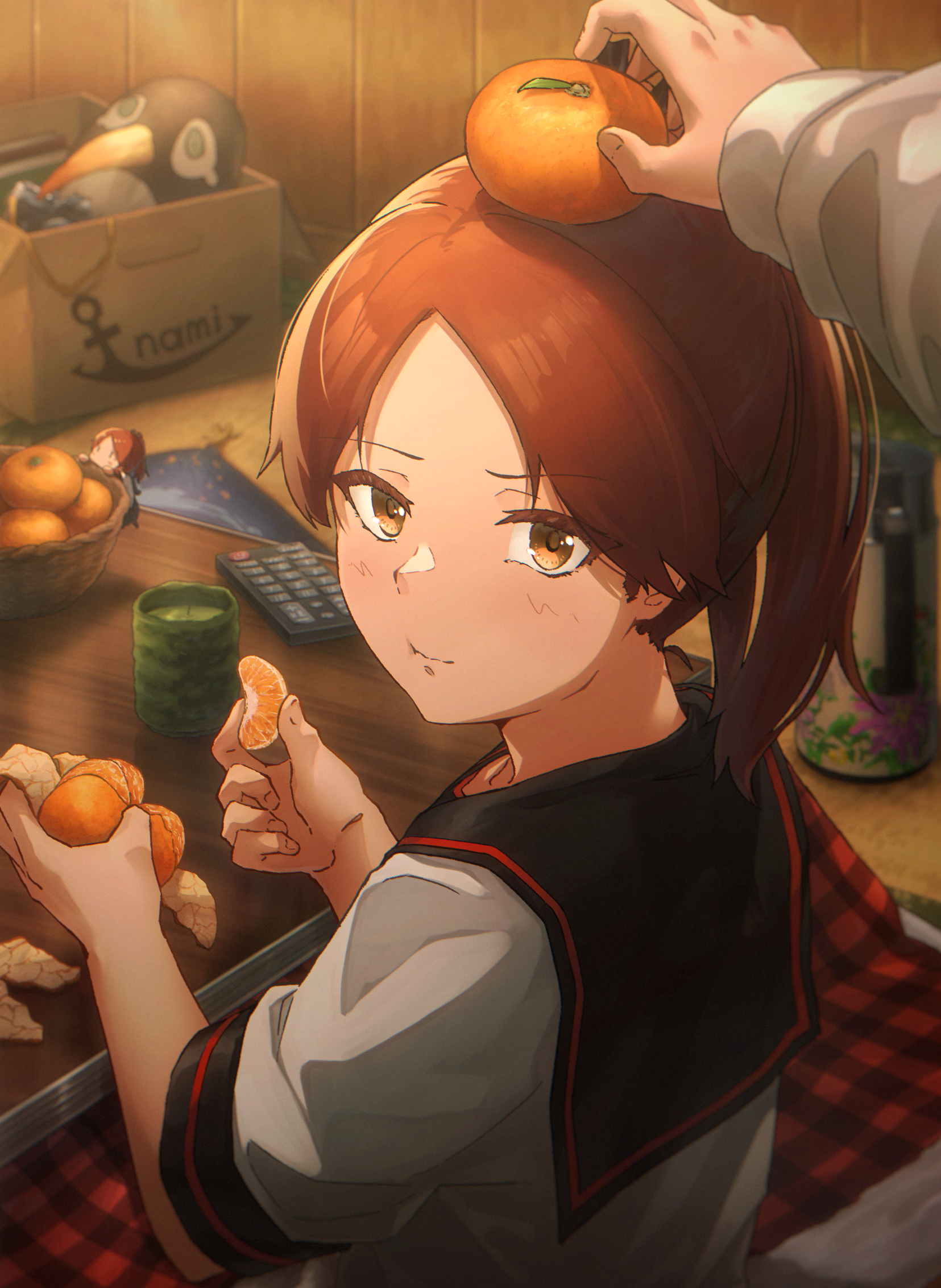 1other 2girls blush brown_eyes brown_hair closed_mouth controller failure_penguin fairy_(kancolle) food food_on_head fruit fruit_on_head highres holding holding_food holding_fruit i-coat indoors kantai_collection kotatsu mandarin_orange multiple_girls object_on_head ponytail remote_control school_uniform serafuku shikinami_(kancolle) shikinami_kai_ni_(kancolle) short_hair short_sleeves table