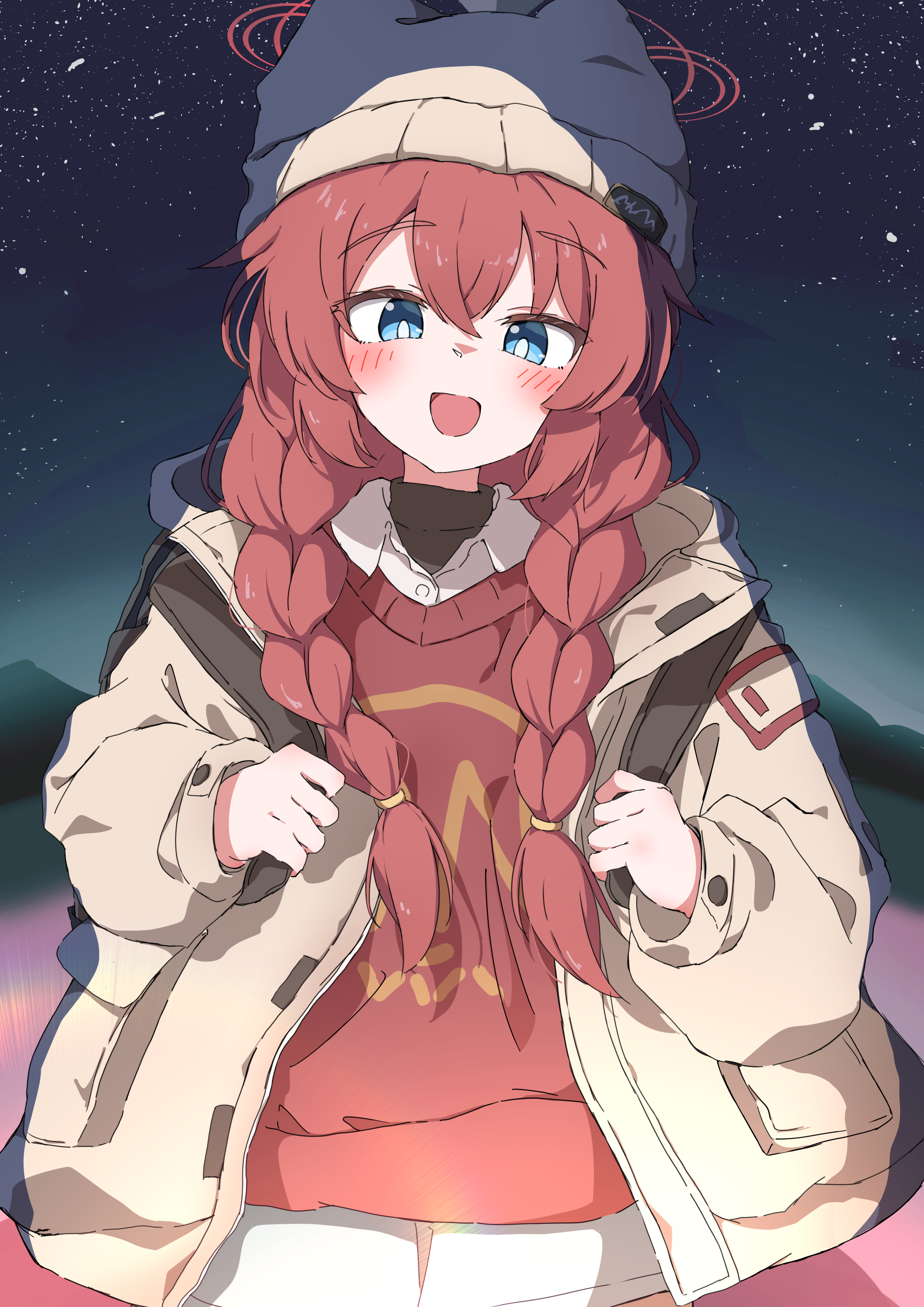 1girl absurdres beanie blue_archive blue_eyes blush brown_shirt collared_shirt cowboy_shot grey_hat grey_jacket grey_shorts hair_between_eyes halo hat highres jacket long_hair long_sleeves looking_at_viewer maki_(blue_archive) maki_(camp)_(blue_archive) natsukari_na night official_alternate_costume official_alternate_hairstyle open_clothes open_jacket open_mouth outdoors red_hair red_halo shirt shorts smile solo white_shirt