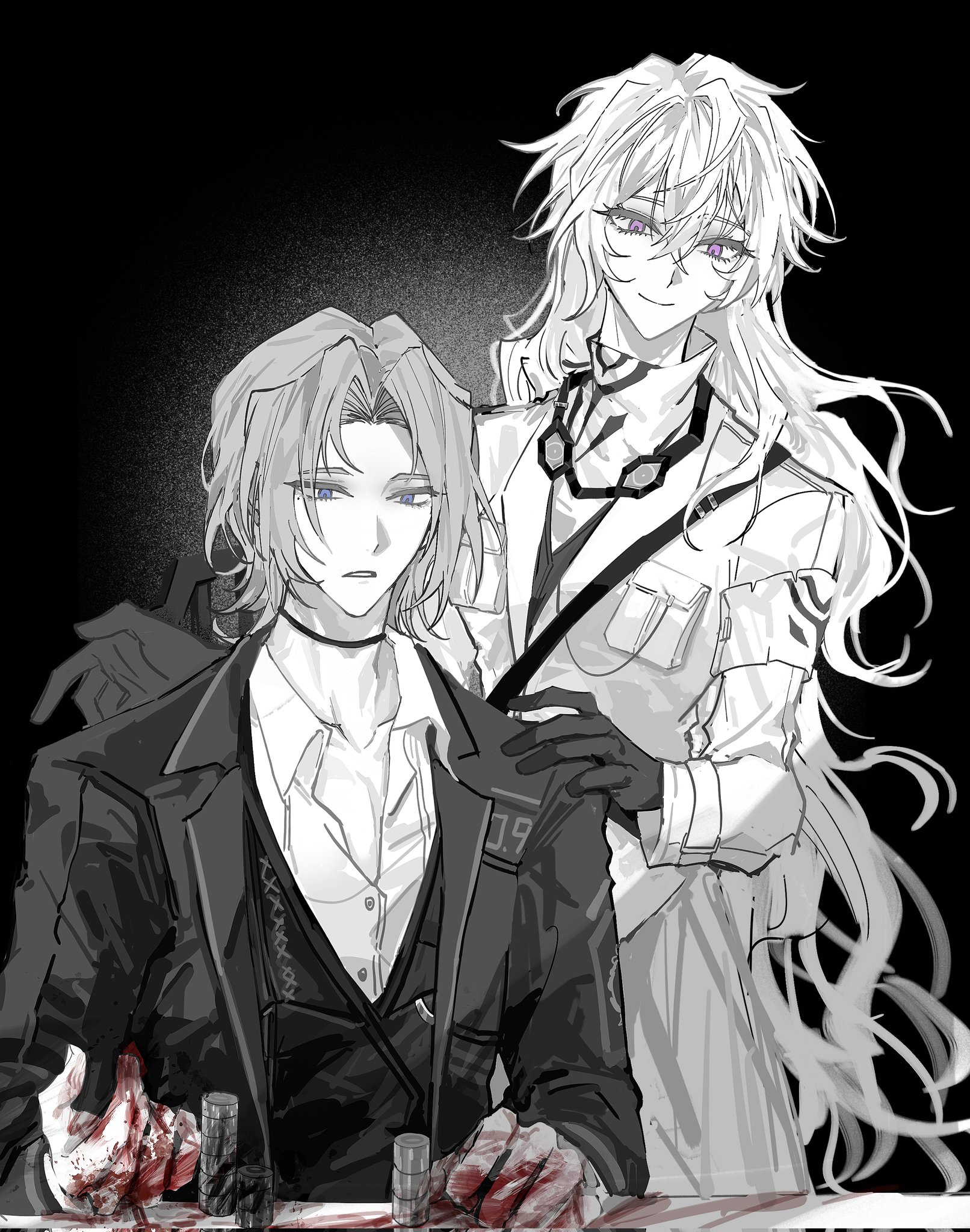 1boy 1girl blood blood_on_hands casino closed_mouth collared_shirt genderswap genderswap_(ftm) genderswap_(mtf) gloves goggles greyscale haloyxxxxxxx highres jacket limbus_company long_hair long_sleeves monochrome parted_bangs poker_chip project_moon purple_eyes recursive_genderswap rodion_(project_moon) shirt smile sonya_(project_moon) spot_color very_long_hair vest