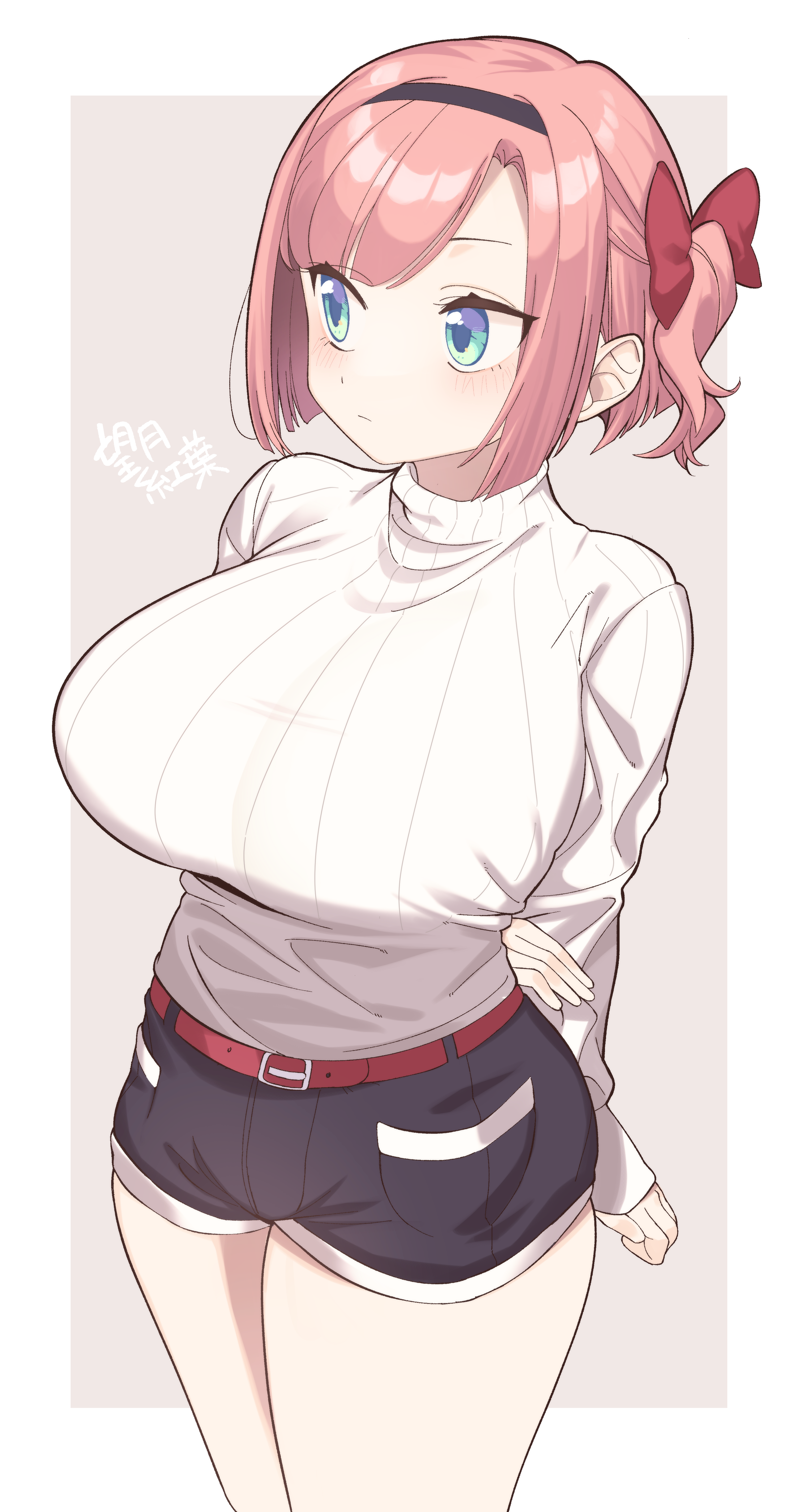 1girl absurdres alternate_costume aqua_eyes belt black_hairband black_shorts bow breasts brown_background casual closed_mouth hair_bow hairband hand_on_own_arm highres huge_breasts long_sleeves looking_to_the_side medium_hair misao_koinu mochizuki_momiji new_game! one_side_up pink_hair red_belt red_bow ribbed_sweater shorts sleeves_past_wrists solo standing sweater thighs white_background white_sweater