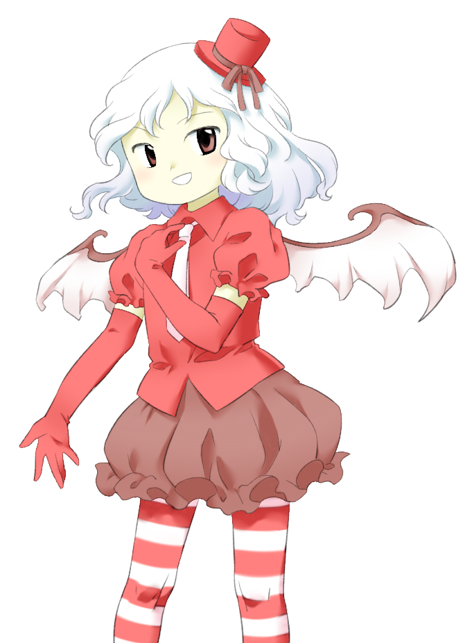 1girl :d bat_wings brown_ribbon brown_skirt bubble_skirt collared_shirt elbow_gloves flat_chest gloves hand_up hat hat_ribbon legs_apart mini_hat mini_top_hat miniskirt necktie nonamejd official_alternate_costume official_style open_mouth pantyhose puffy_short_sleeves puffy_sleeves red_eyes red_gloves red_hat red_shirt remilia_scarlet ribbon shirt short_hair short_sleeves silent_sinner_in_blue skirt smile solo standing striped_clothes striped_pantyhose top_hat touhou touhou_bougetsushou white_hair white_necktie white_wings wings zun_(style)