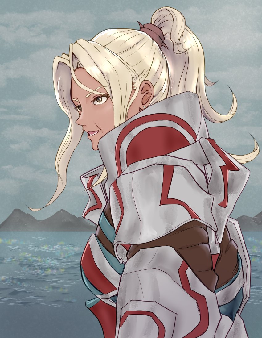 1girl armor blue_sky brown_eyes cloud commentary_request dark-skinned_female dark_skin ear_piercing eyelashes fire_emblem fire_emblem_engage hair_intakes marie_dqx medium_hair mountainous_horizon nintendo open_mouth outdoors piercing ponytail saphir_(fire_emblem) sky solo teeth water white_hair