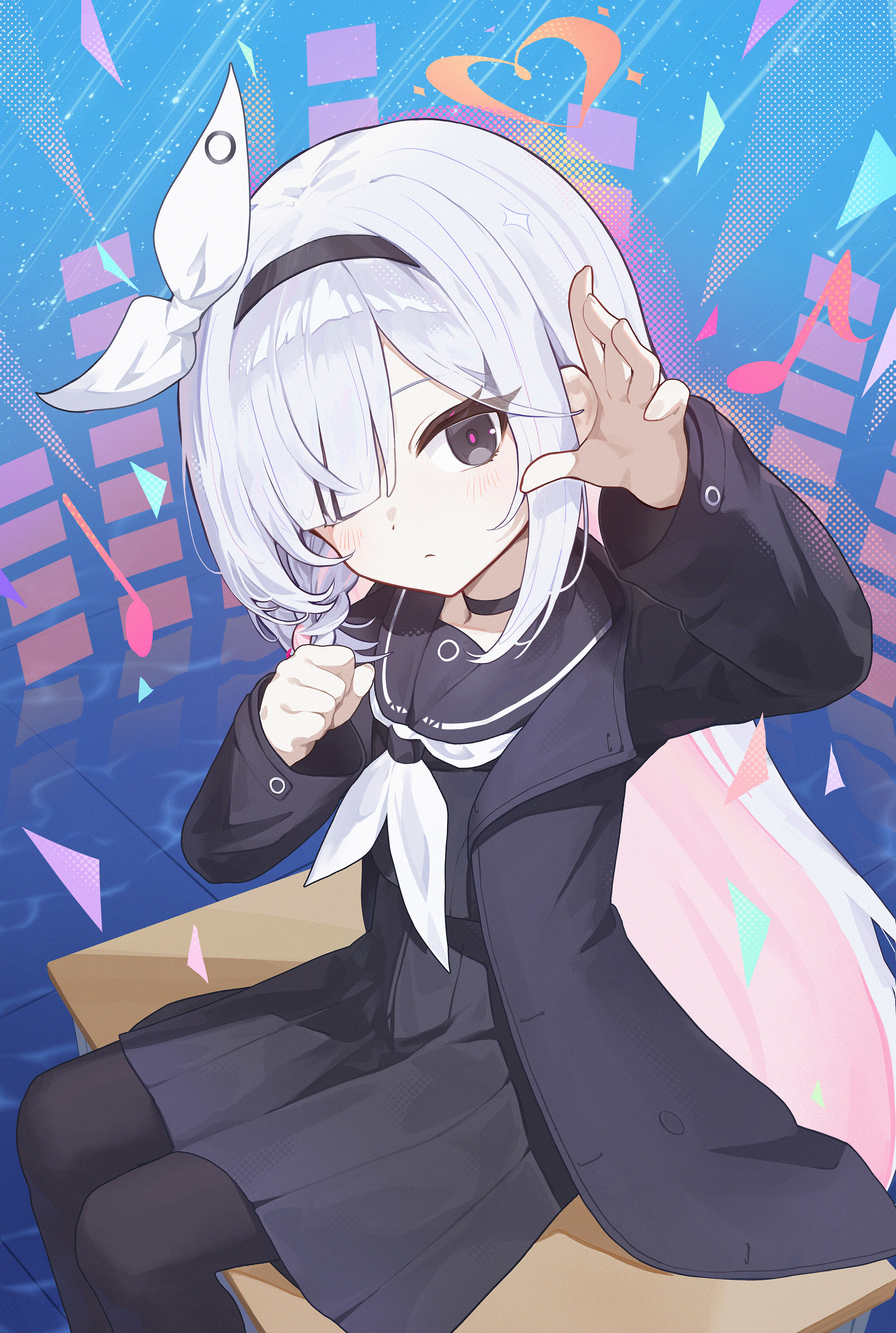 1girl absurdres black_choker black_coat black_eyes black_hairband black_pantyhose black_sailor_collar black_serafuku black_shirt black_skirt blue_archive braid choker closed_mouth coat colored_inner_hair commentary desk feet_out_of_frame hair_over_one_eye hair_ribbon hairband halo heart heart_halo highres long_bangs long_hair long_sleeves looking_at_viewer multicolored_hair musical_note neckerchief pantyhose pellas_(panix2383) pink_hair plana_(blue_archive) pleated_skirt red_halo red_pupils ribbon sailor_collar school_desk school_uniform serafuku shirt side_braid single_braid sitting skirt solo two-tone_hair very_long_hair white_hair white_neckerchief white_ribbon wide_sleeves