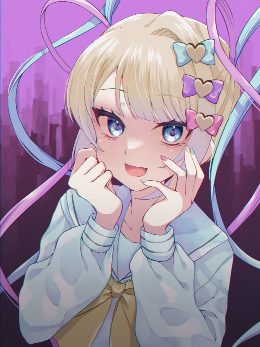 1girl :d blonde_hair blue_bow blue_eyes blue_hair blue_nails blue_shirt bow chouzetsusaikawa_tenshi-chan hair_bow hands_on_own_face hands_up heart heart_in_eye highres long_hair long_sleeves looking_at_viewer multicolored_hair multicolored_nails multiple_hair_bows mumei_(yr_0920) nail_polish needy_girl_overdose open_mouth pink_background pink_bow pink_hair pink_nails purple_bow quad_tails sailor_collar shirt smile solo symbol_in_eye upper_body yellow_bow yellow_nails