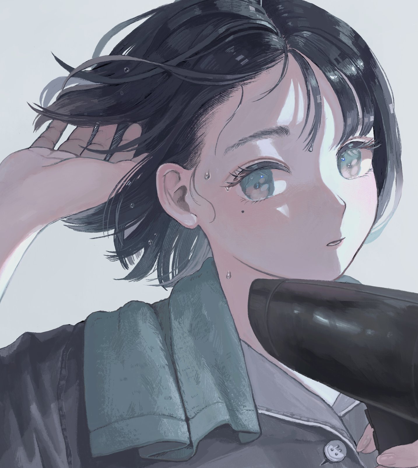 1girl black_hair blue_eyes buttons commentary drying drying_hair drying_own_hair grey_background grey_shirt hair_dryer hand_in_own_hair hand_up hanio3 highres holding holding_hair_dryer looking_at_viewer mole mole_under_eye original parted_lips shirt short_hair simple_background solo untranslatable_commentary towel towel_around_neck upper_body wet