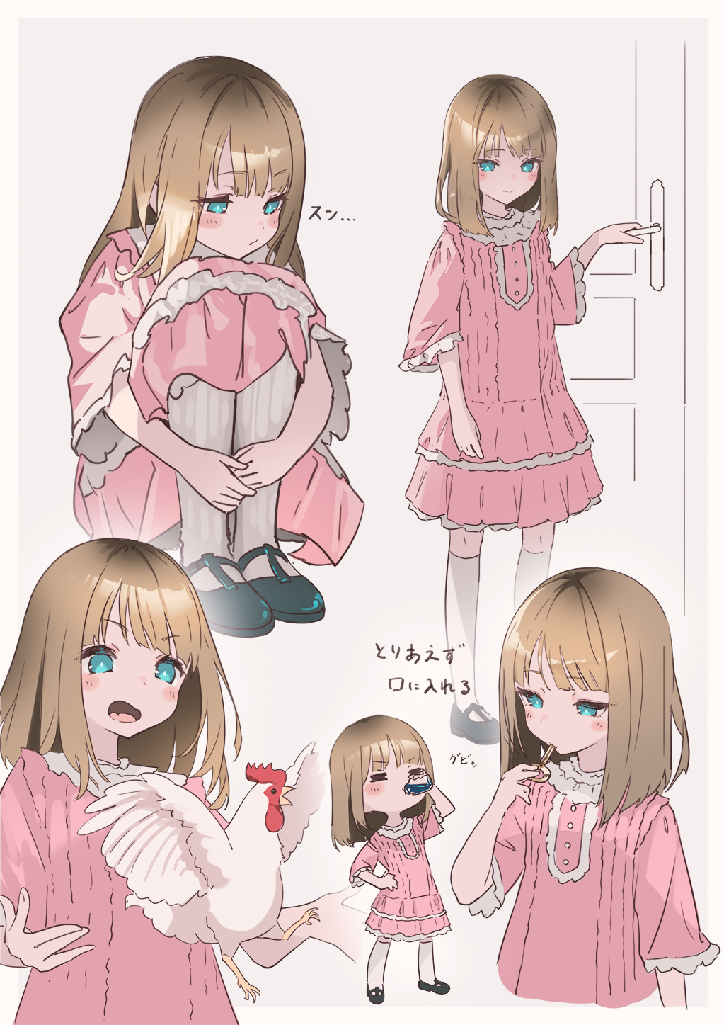 1girl :s alice_(alice_in_wonderland) alice's_adventures_in_wonderland bird blue_eyes blue_footwear blush_stickers bottle buttons chibi chicken closed_mouth door doorknob dress drinking frilled_dress frilled_shirt_collar frilled_sleeves frills full_body grey_background hand_on_own_hip highres holding holding_bottle holding_key hugging_own_legs key key_in_mouth kneehighs knees_up leaning_back light_brown_hair medium_hair multiple_views neco_z_alenky open_mouth opening_door pink_dress rooster simple_background slippers socks standing translation_request upper_body wakuseiy white_socks wide_sleeves