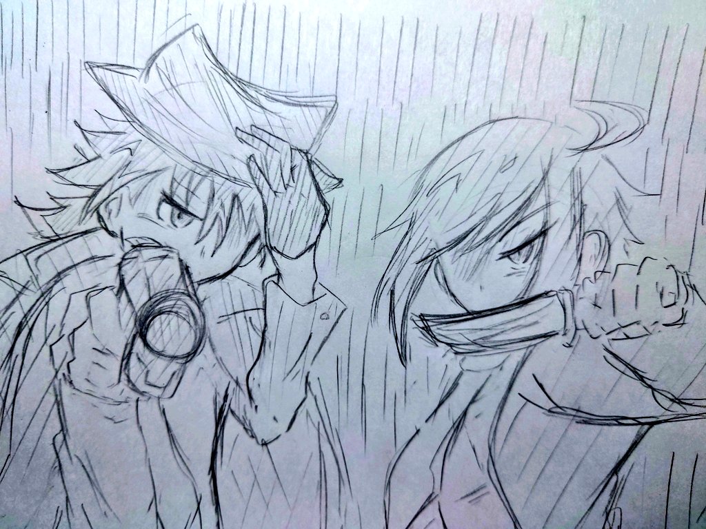 1boy 1girl digimon digimon_rearise female_protagonist_(digimon_rearise) gun knife looking_at_viewer male_protagonist_(digimon_rearise) rain weapon
