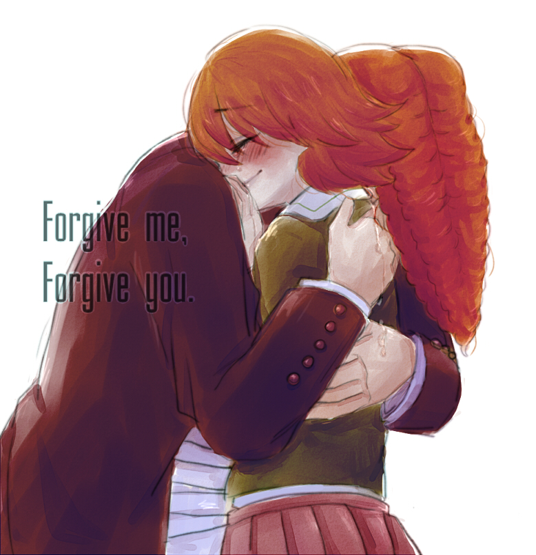 2boys 321654 blush brown_hair closed_eyes closed_mouth crossdressing crossdressing_(mtf) crying danganronpa:_trigger_happy_havoc danganronpa_(series) english_text fujisaki_chihiro gakuran hug multiple_boys owada_mondo pompadour school_uniform skirt smile trap white_background