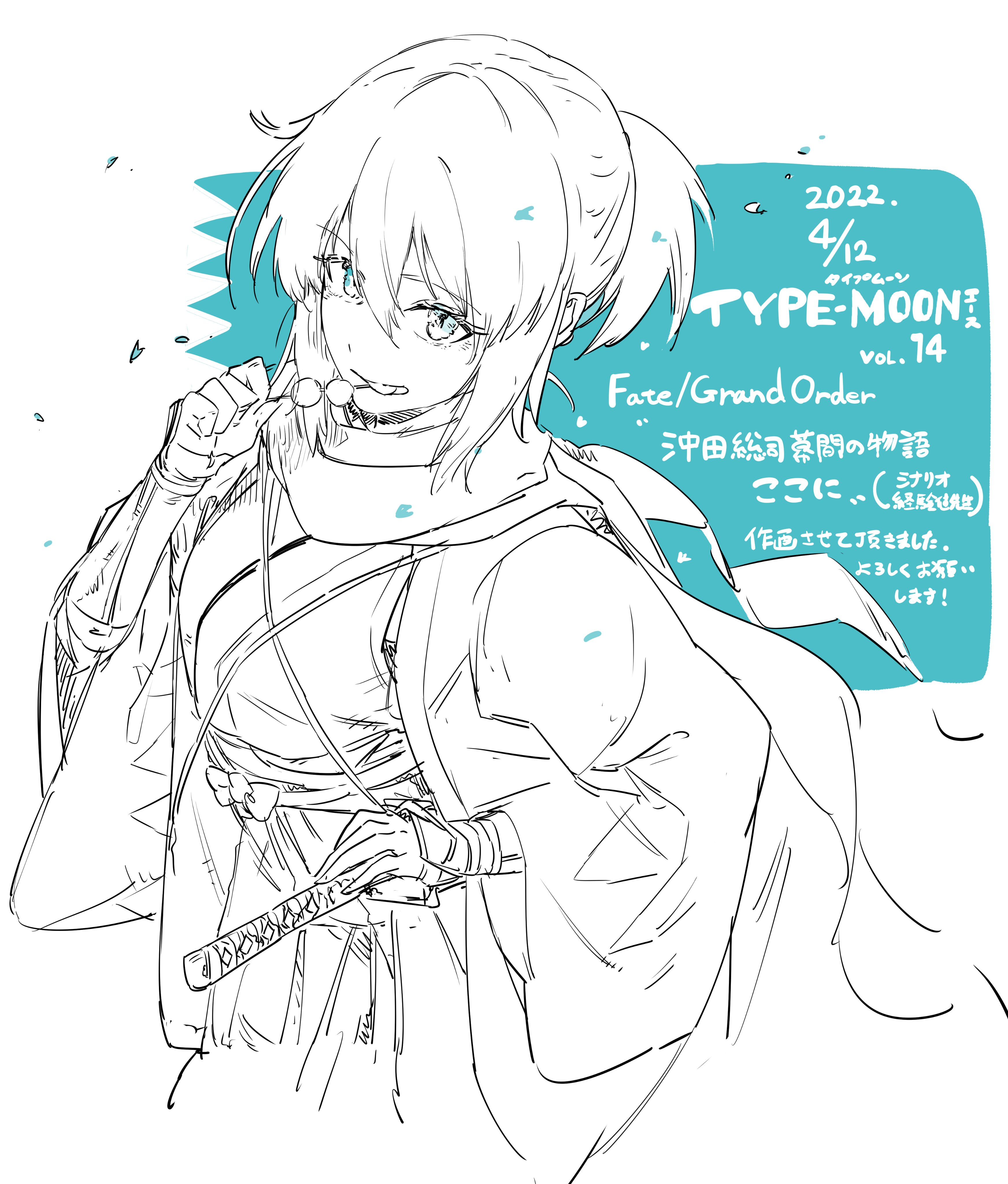 1girl absurdres blue_theme dango fate/grand_order fate/type_redline fate_(series) food greyscale hair_between_eyes haori highres hirano_ryouji holding holding_food japanese_clothes kimono koha-ace looking_at_viewer monochrome okita_souji_(fate) okita_souji_(koha-ace) okita_souji_(teal_haori_and_hakama)_(fate) ponytail scarf short_hair sidelocks simple_background smile solo spot_color sword upper_body wagashi weapon
