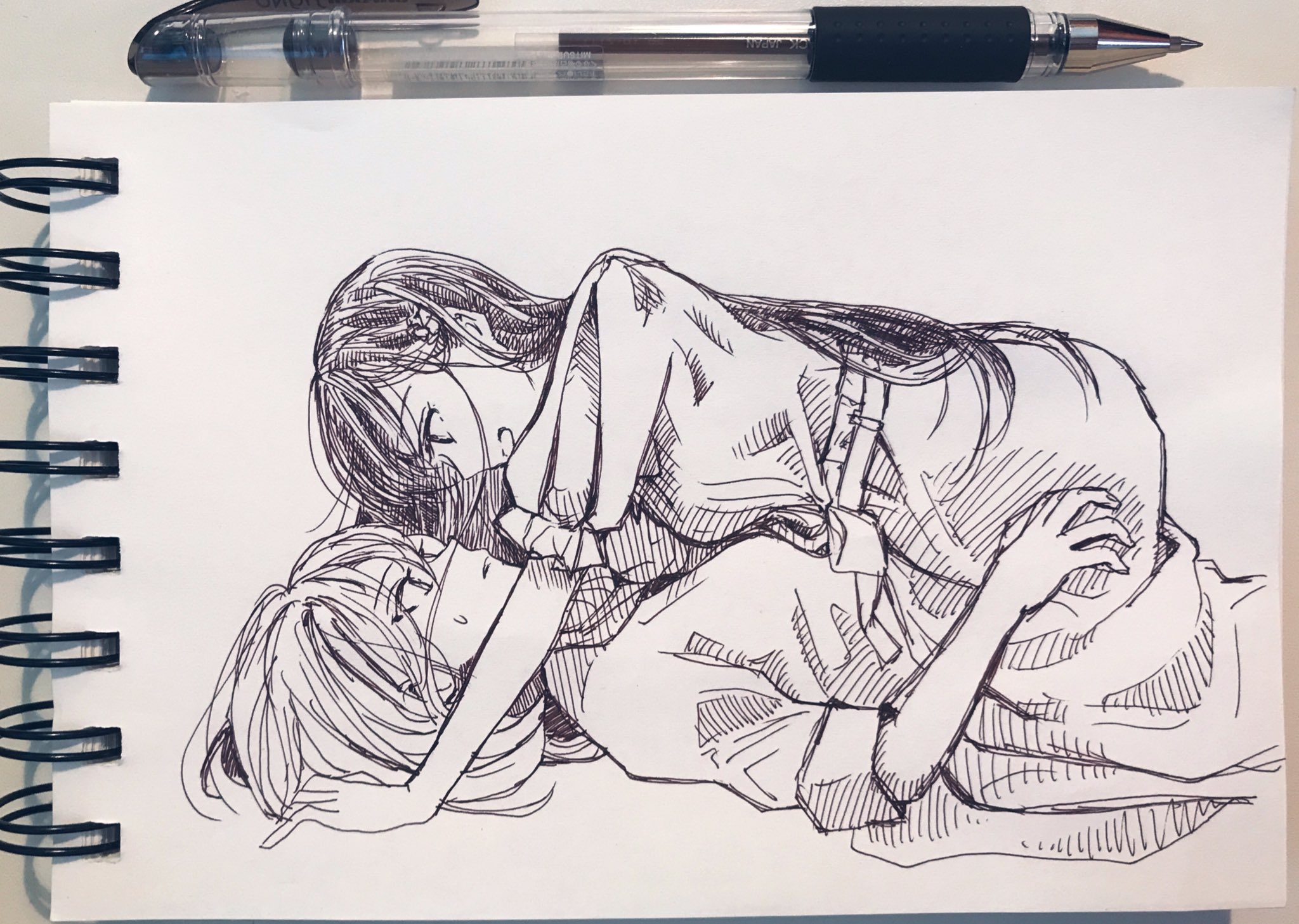 2girls art_tools_in_frame asaka_kaori ballpoint_pen_(medium) belt breasts commentary_request derivative_work dress eye_contact hatching_(texture) highres hoshikawa_shizuku kimi_to_tsuzuru_utakata long_hair looking_at_another lying medium_breasts mitsu_(mitsum) multiple_girls on_back open_mouth parted_lips pen pen_(medium) photo_(medium) puffy_short_sleeves puffy_sleeves short_hair short_sleeves sweatdrop traditional_media yukadon yuri