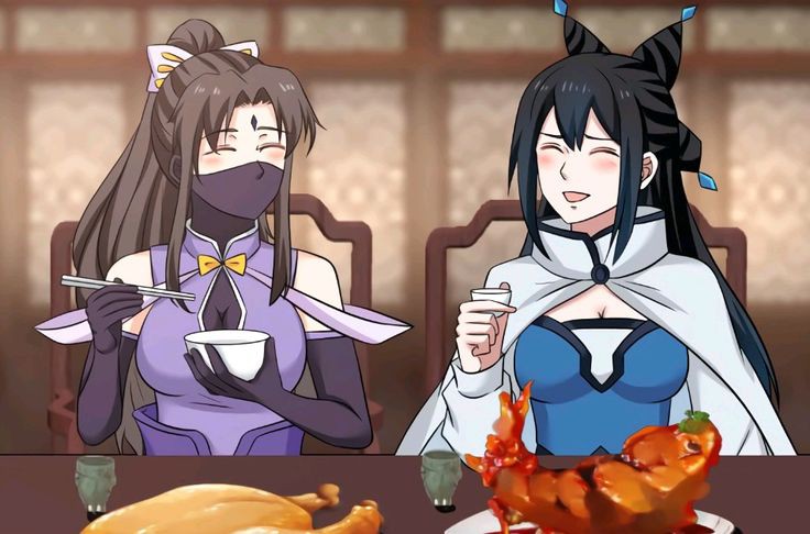 2girls black_hair blue_dress blush brown_hair cape chair chan_xia_ning closed_eyes dress eating long_hair long_sleeves martial_peak multiple_girls open_mouth purple_dress purple_sleeves ribbon sitting smile su_yan table very_long_hair white_cape white_ribbon