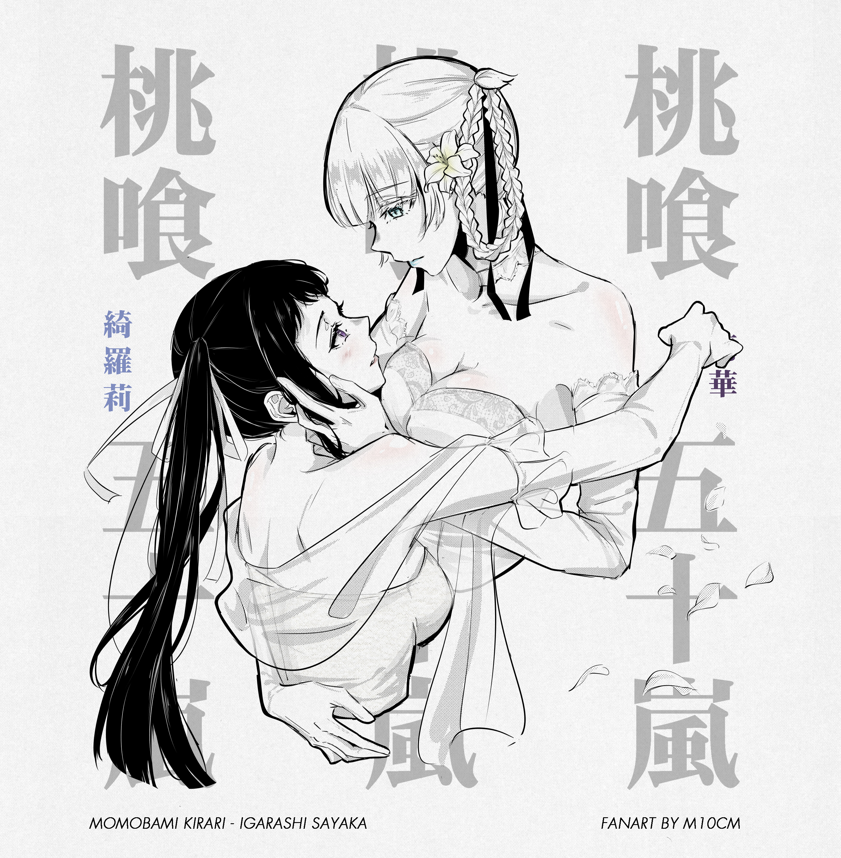 2girls absurdres aqua_lips artist_name bare_shoulders black_ribbon blue_eyes blush breasts character_name cleavage dress earrings english_text female_focus flower gloves hair_flower hair_ornament hair_ribbon highres hug igarashi_sayaka jewelry kakegurui lily_(flower) long_hair looking_at_another m10cmdesu medium_breasts momobami_kirari multiple_girls open_mouth ribbon simple_background skirt twintails upper_body wedding_dress wife_and_wife yuri