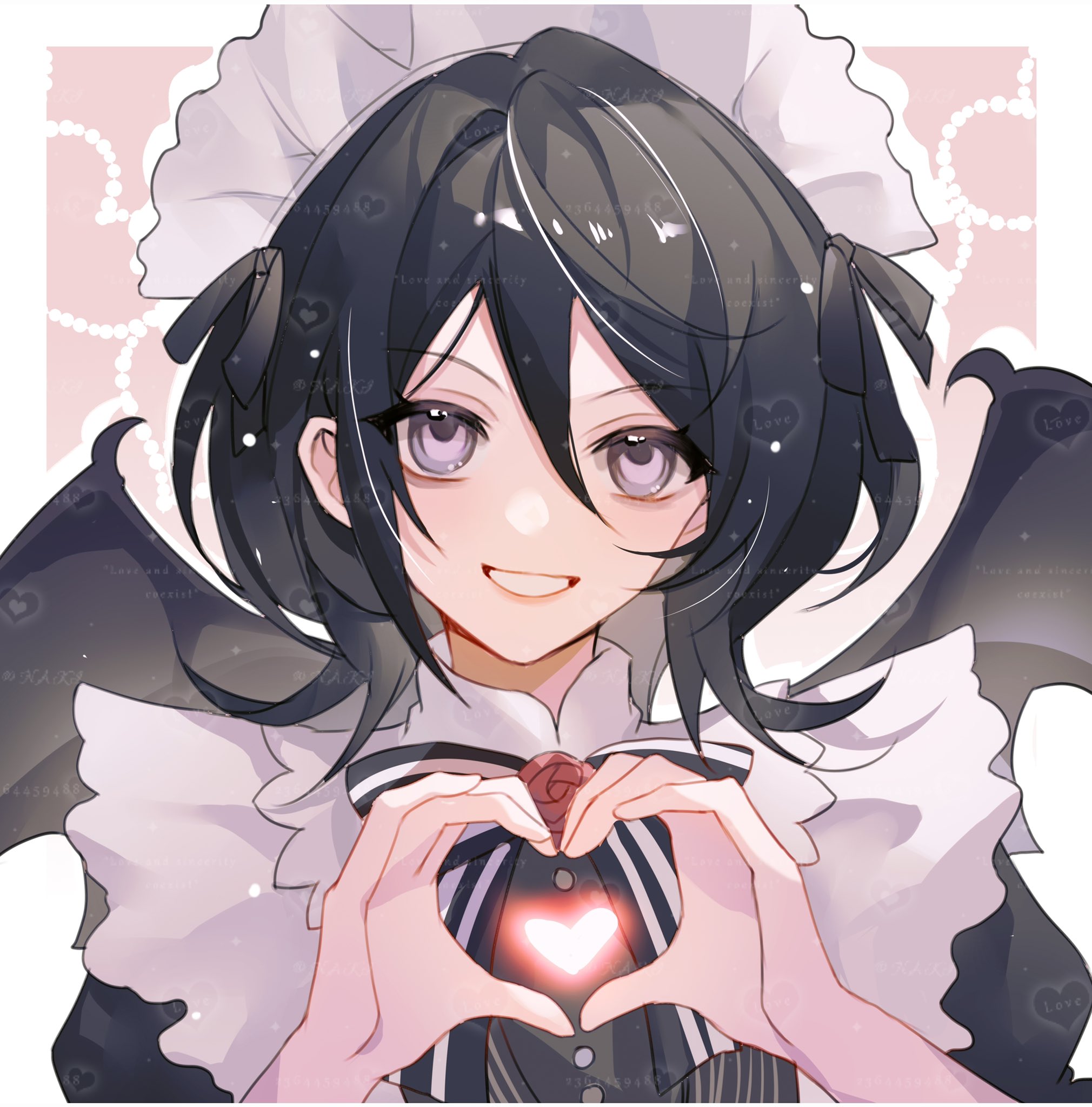 1girl black_hair bleach choro-nakini dress heart heart_hands highres kuchiki_rukia long_hair looking_at_viewer maid maid_headdress purple_eyes shinigami smile solo wings