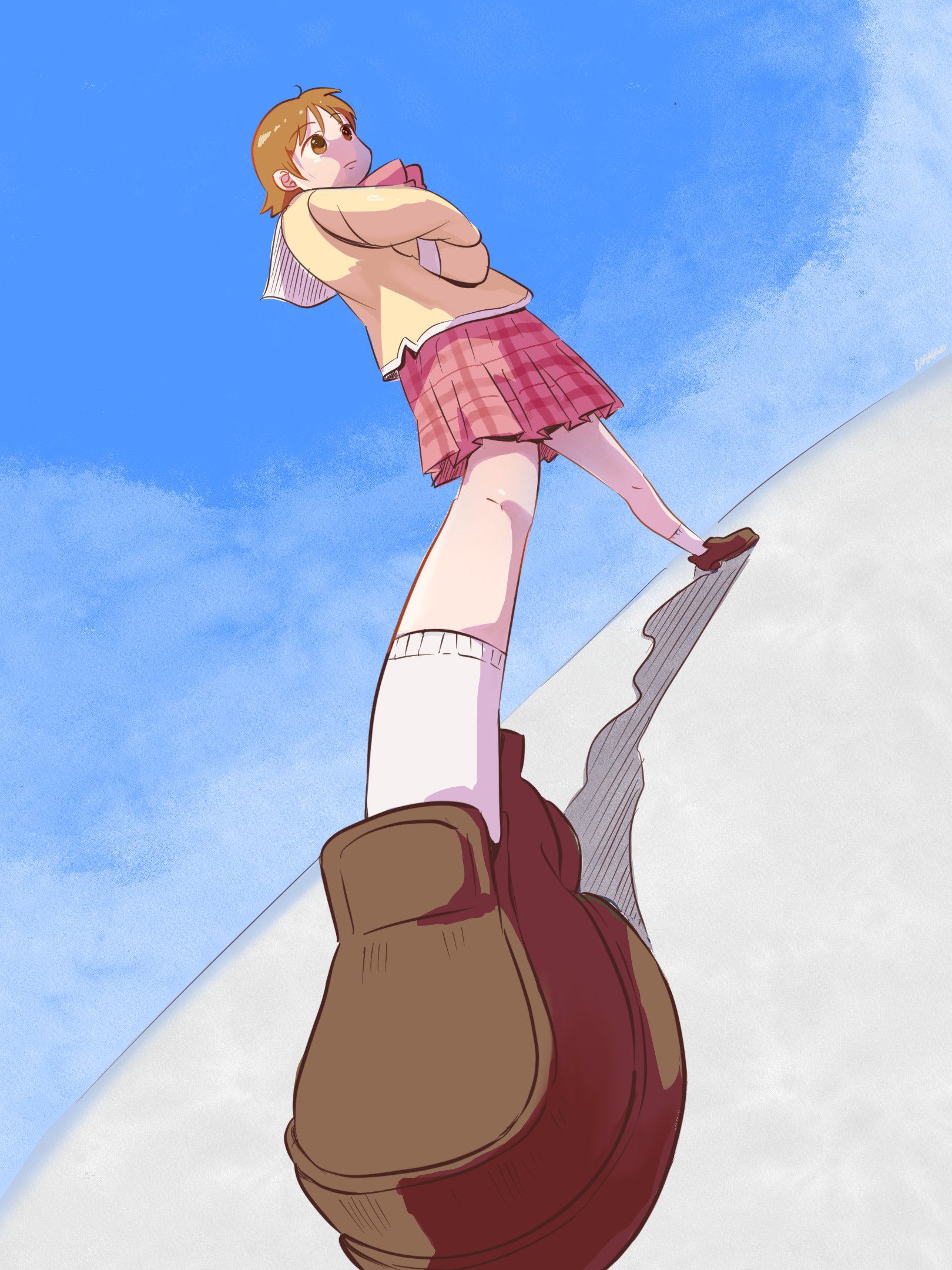 1girl aioi_yuuko blue_sky brown_eyes brown_hair clear_sky crossed_arms dress dutch_angle foreshortening highres loafers meme neck_ribbon nichijou pleated_skirt red_dress ribbon sailor_collar school_uniform shoes short_hair skirt sky socks spread_legs sun_visor_(mata69) tokisadame_school_uniform white_sailor_collar white_socks