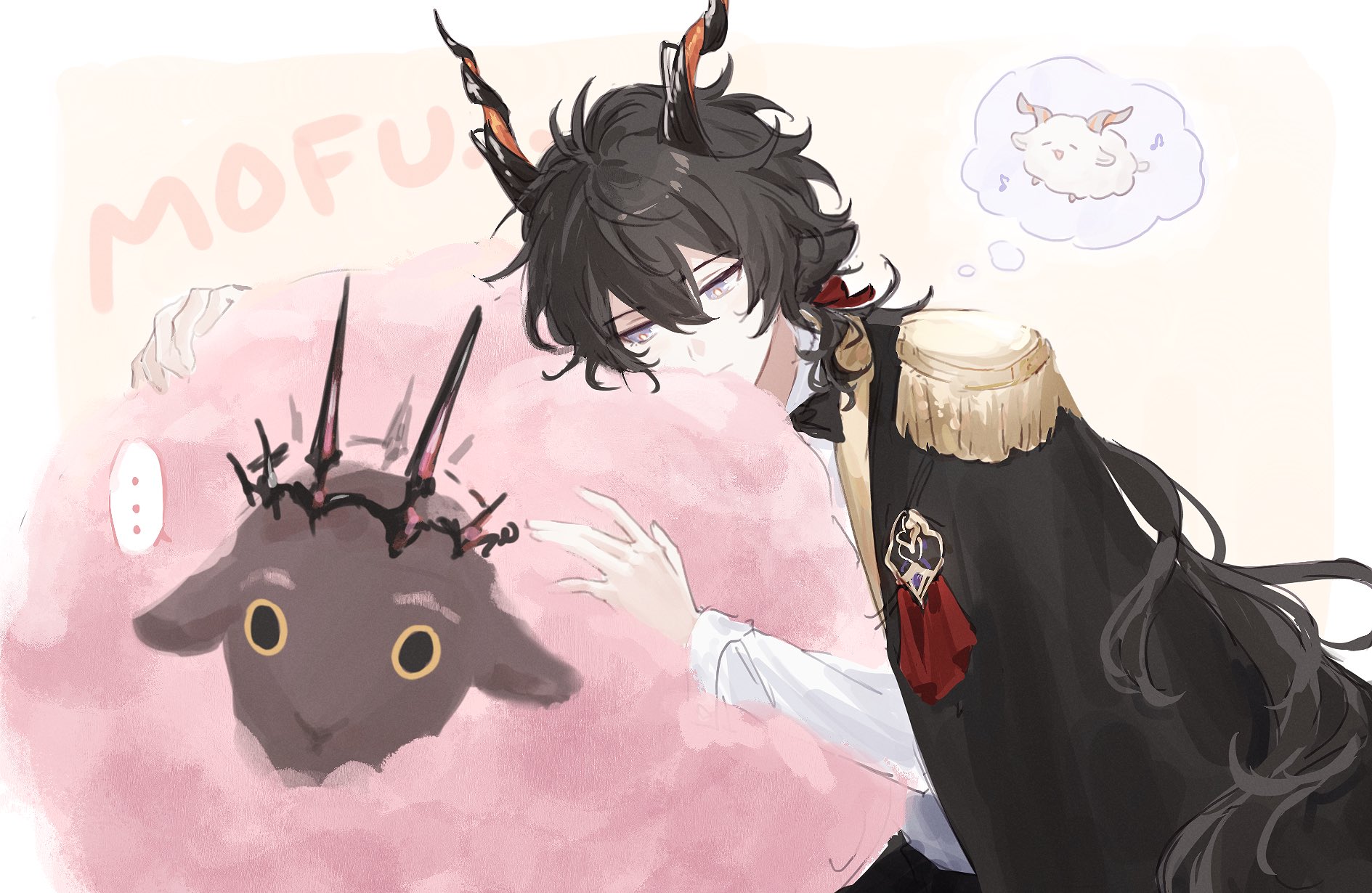 ... 1boy animal animal_ears animal_hug animalization arknights black_cape black_hair border cape commentary dolly_(arknights) ebenholz_(arknights) epaulettes frown goat_boy goat_ears goat_horns half-closed_eyes highres horns hug kreide_(arknights) long_hair male_focus musical_note purple_eyes rei_(926qz) sheep shirt simple_background speech_bubble spoken_ellipsis thought_bubble upper_body white_background white_shirt yellow_background