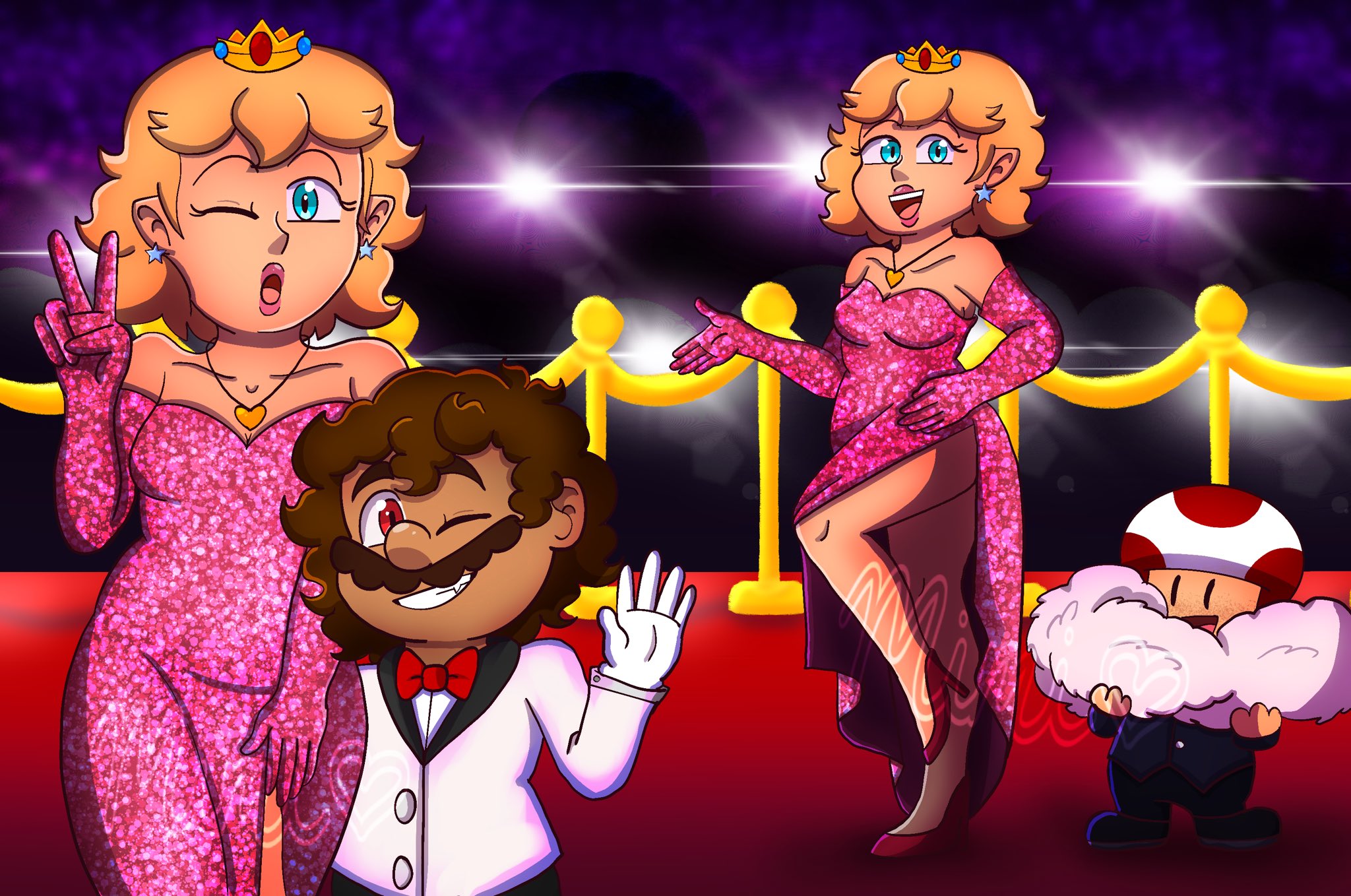 1girl 2boys blonde_hair breasts brown_hair car cleavage coat crown dress earrings facial_hair formal_clothes fur_coat gloves grin high_heels highres jewelry legs looking_at_viewer mario mario_(series) medium_breasts motor_vehicle multiple_boys mustache night nintendo one_eye_closed pink_dress princess_peach red_carpet sky smile standing suit super_mario_all_stars toad_(mario) v wink