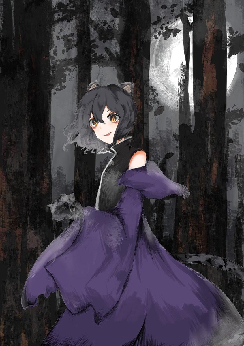 1other animal_ears animal_hands bags_under_eyes bare_shoulders black_hair black_shirt collared_shirt cowboy_shot evergreen_(artist) fang forest full_moon green_eyes high_collar highres hood hood_down hooded_jacket jacket jacket_partially_removed len'en leopard_ears leopard_tail long_sleeves looking_at_viewer medium_hair moon nature night missing_headwear non-web_source open_clothes open_jacket open_mouth purple_hood purple_jacket purple_sleeves shirt shitodo_kuroji sky sleeveless sleeveless_shirt slit_pupils smile solo source_request tail transformation wavy_hair wide_sleeves