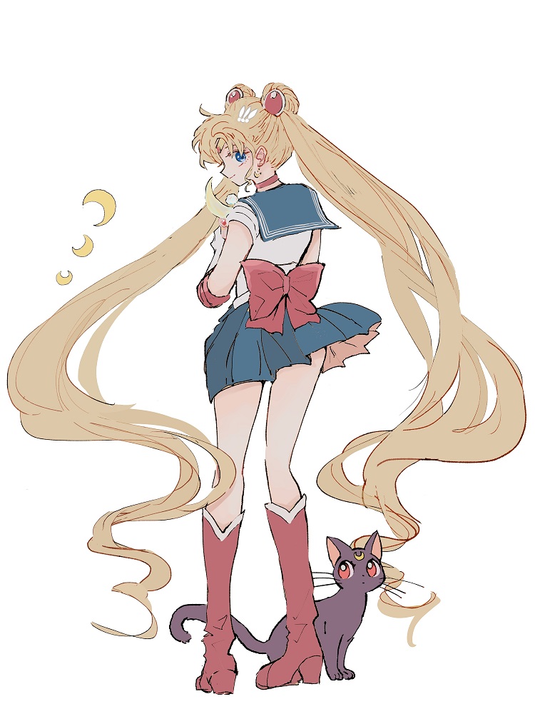 1girl absurdly_long_hair back_bow bishoujo_senshi_sailor_moon black_cat blonde_hair blue_eyes blue_neckerchief blue_skirt boots bow cat choker crescent crescent_earrings earrings elbow_gloves floating_earrings from_behind full_body gloves hair_ornament happy holding holding_wand jewelry knee_boots long_hair looking_back luna_(sailor_moon) miniskirt neckerchief nocoyaki red_background red_bow red_choker red_eyes red_footwear sailor_moon simple_background skirt smile standing tiara twintails very_long_hair wand white_gloves