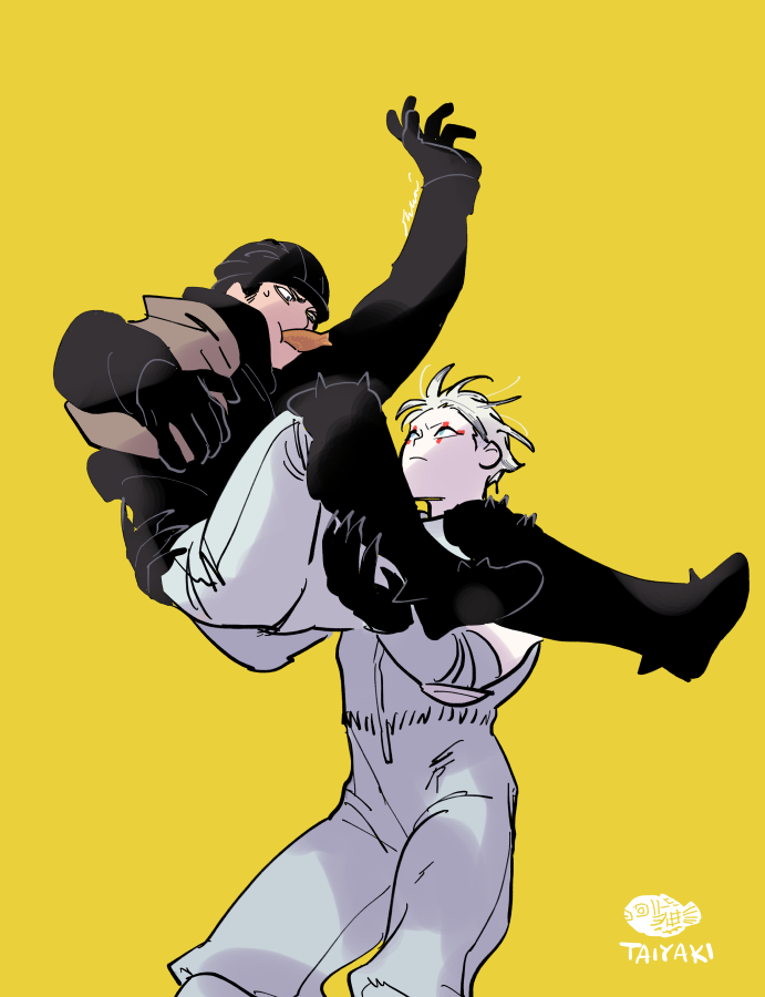 2boys aikawa_(dorohedoro) black_hair blonde_hair carrying colored_tips couple dorohedoro eye_contact facial_mark feet_out_of_frame food_in_mouth from_below gloves lifting_person looking_at_another male_focus medium_sideburns multicolored_hair multiple_boys no_eyebrows pants princess_carry risu_(dorohedoro) sibasumi sideburns thick_eyebrows yaoi